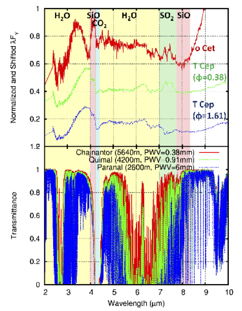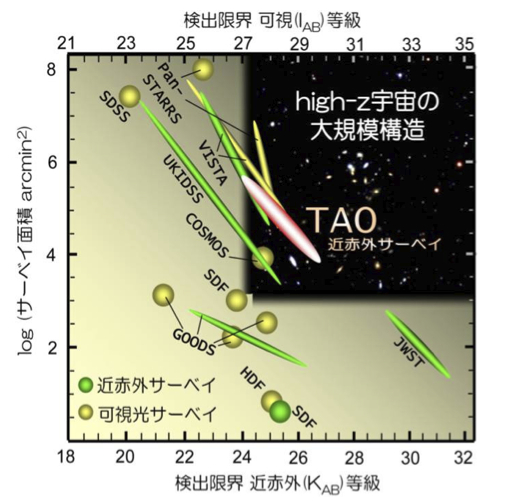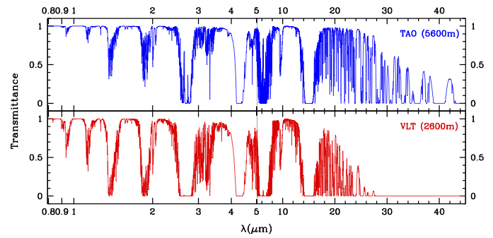 Science with TAOAdvantages of TAOSince astronomy is the study of various phenomena in the Universe, observations over a wide wavelength range are essential to understand their properties. Infrared astronomy has the second-longest history, after optical astronomy, and has proven very useful for providing new information. However, observations in at infrared wavelengths are not easy because infrared light is strongly absorbed by the earth's atmosphere. The TAO telescope is being built at the world highest site (5640m), where the atmosphere is exceptionally transparent even in the infrared. In the near-infrared wavelength range, discrete atmospheric gwindowsh called the J, H, K-bands coalesce into one continuous window at the TAO site. In addition, a new window from 25 to 40 microns appears in the mid infrared. The ability to work at these wavelengths is a unique capability for TAO and one of its strongest advantages. To utilize this excellent observing environment, the TAO telescope has two state-of-the-art instruments called SWIMS and MIMIZUKU. SWIMS (Simultaneous-color Wide-field In- frared Multi-object Spectrograph) is an instrument optimized for near-infrared observations. It has a unique spectroscopic capability covering 0.9-2.5 micron continuously. This is very useful for observations of spectral lines in red-shifted galaxies. Its ability to perform simultaneous observations in two different wavelength bands, as well its wide field-of-view of 9.6f, enables us to carry out surveys with high efficiency, which is a key for studying galaxy evolution, cosmology, and searching for rare objects. Light at longer mid-infrared wavelengths is observed by the MIMIZUKU (Mid-Infrared Multi-field Imager for gaZing at the UnKnown Universe) instrument. It covers a very wide wavelength range from 2 to 38 microns. The longer mid-infrared region from 26 to 38 microns is accessible only to TAO/MIMIZUKU. Thanks to its higher spatial resolution, compared to satellite telescopes in this wavelength range, MIMIZUKU is a very powerful tool for studying planet formation and the origin of materials. Furthermore, MIMIZUKU has a unique function of simultaneous observations of two discrete fields of view, which enables us to carry out accurate monitoring in the mid-infrared.