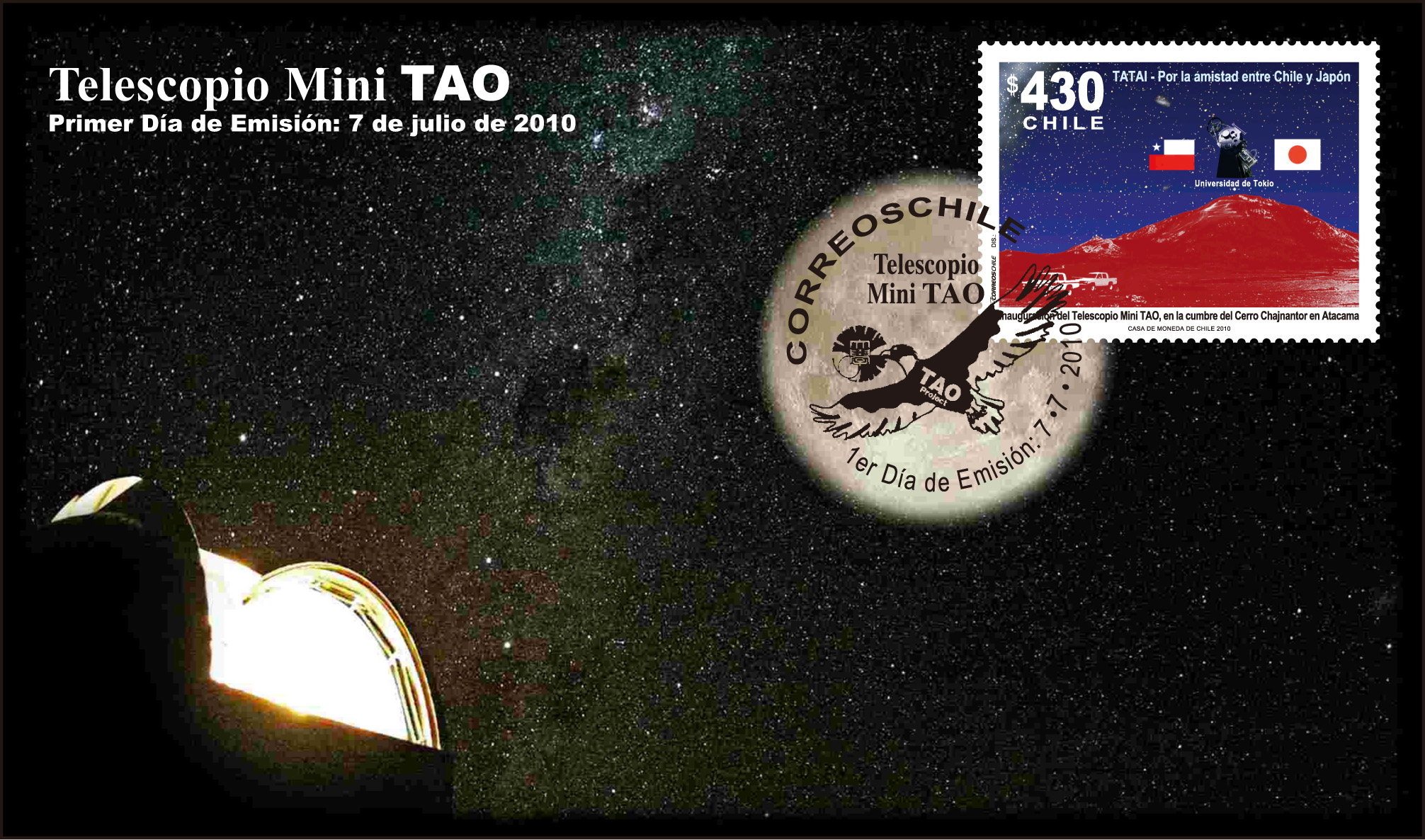 The first day cover, which is an envelope with a special postmark of the date of the issue. The milky way and the dome taken at the summit (face side), and the astronomical objects taken with the miniTAO telescope (back side) is designed on the envelope.