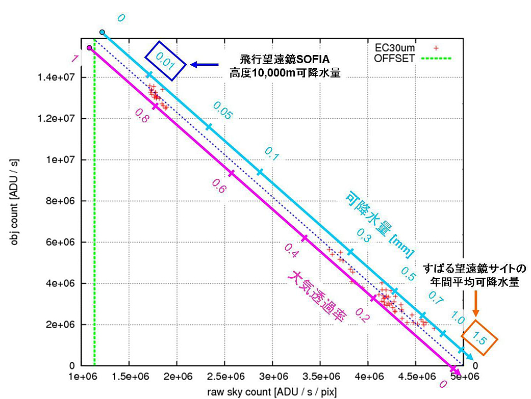 Atmospheric transmittance measured at the summit of ChajnantorGround-based observations in the 30 micron band is not easy because light from stellar objects is strongly affected by earth's atmosphere. The mini-TAO telescope at 5,640-m altitude can drastically reduce the influences by the atmosphere. In this study, it has been confirmed that the atmospheric transmittance above the summit of Chajnantor is drastically changed in a short time and found out that the time variation is caused by variation of a precipitable water vapor (PWV). This study has indicated that the atmospheric transmittance reaches to 80 % at 31 microns, corresponding to 0.05 mm in PWV, in the best condition. This is a surprising result. The PWV of 0.05 mm is close to that at 10,000-m altitude where the telescope on-board an airplane, Stratospheric Observatory for Infrared Astronomy SOFIA, operated by NASA carries out observations. Comparing the yearly average value of PWV of 1.5 mm at the summit of Maunakea in Hawaii where Subaru telescope is observing, the summit of Chajnantor is extremely dried site suitable for infrared observations. Figure 3 shows relationship between sky brightness at 31 microns (horizontal axis) and apparent stellar brightness (vertical axis). The atmospheric transmittance at 31 microns and PWV are derived from the relationship of the both brightnesses and are presented along red and blue axises, respectively. Data values obtained within 3 hours in the day are plotted in red crosses distributing around 10 to 30 and 80 % of atmospheric transmittance. This figure presents that the atmospheric transmittance at 31 microns is drastically changes in a short time.