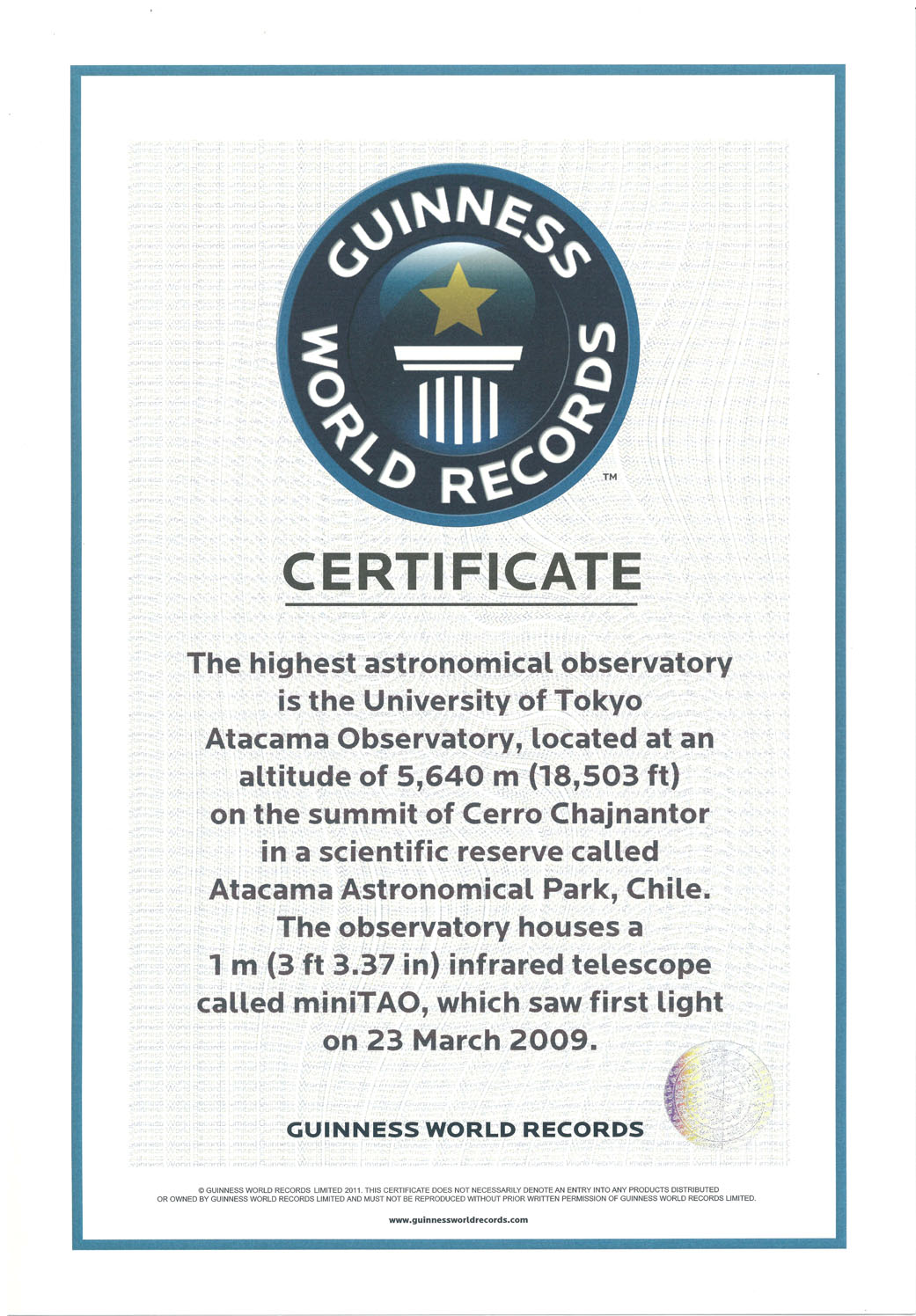 The University of Tokyo Atacama Observatory was Certified by Guinness World Record as the Highest Astronomical Observatory