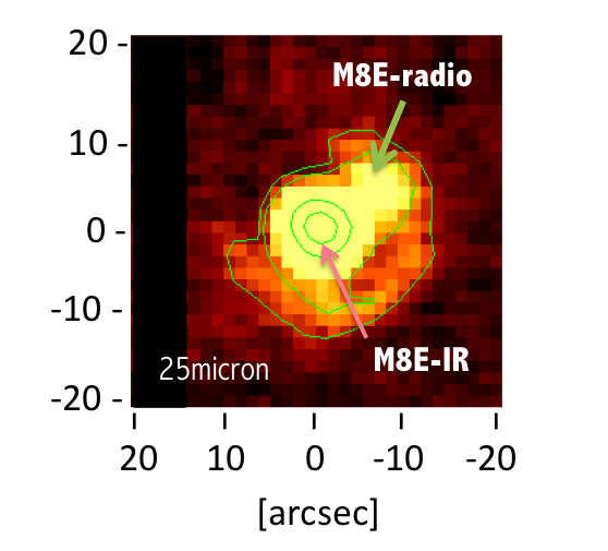 In this thesis, M8E, a massive star forming region, was observed with MAX38, which have been developed and operated by Miyata Laboratory, a mid-infrared research group to which the author belongs. Massive stars in early formation stage are not observable in the visible and near-infrared wavelengths because they are born in thick dusty cores. Mid-infrared observations are very useful to investigate such dusty regions because mid-infrared light can penetrate the dusty regions more deeply than visible and near-infrared light and resolve more finely than far-infrared and radio waves. MAX38 on the miniTAO 1-m telescope in the Atacama Desert, Chile, was used for the observations. The author actually went there and conducted the observations. M8E, the target, is a massive star forming region at a distance of 1.5 kpc from the sun. It consists of two objects, M8E-IR and M8E-radio. M8E-IR is a young stellar object enough bright to be observable in the near-infrared wavelengths. M8E-radio is a radio source (but very dark in the near-infrared wavelengths) which is thought to have evolved more than M8E-IR. There had been no imaging observations of M8E-radio in the visible and infrared bands, except that it had been imaged separately from M8E-IR at a wavelength of 24.5 um by COMICS on the Subaru telescope. In this work, M8E region was imaged at 30 and 37 um, and the two objects were spatially decomposed for the first time by our observations. The total luminosity and mass of each object were successfully estimated from the data. It was found that M8E-radio is less-massive star than M8E-IR. If stars with various mass are born at once in one molecular cloud, higher-mass stars evolve faster. Then, assuming the two objects in M8E region were born at once in the same molecular cloud, as usually thought, the relation of their mass and evolutional stages contradict our estimation. Finally, it was estimated that M8E-radio had been born at 30,0000 years before M8E-IR was born. Such born-time difference of stars has been found in the massive star clusters, with a spatial scale more than ten times larger than the massive star forming region like M8E. However, in the massive star forming region with smaller spatial scale, it has not been confirmed because of the lack of detailed observations. The discovery of the born-time difference is very interesting to investigate massive star formation in molecular clouds. |