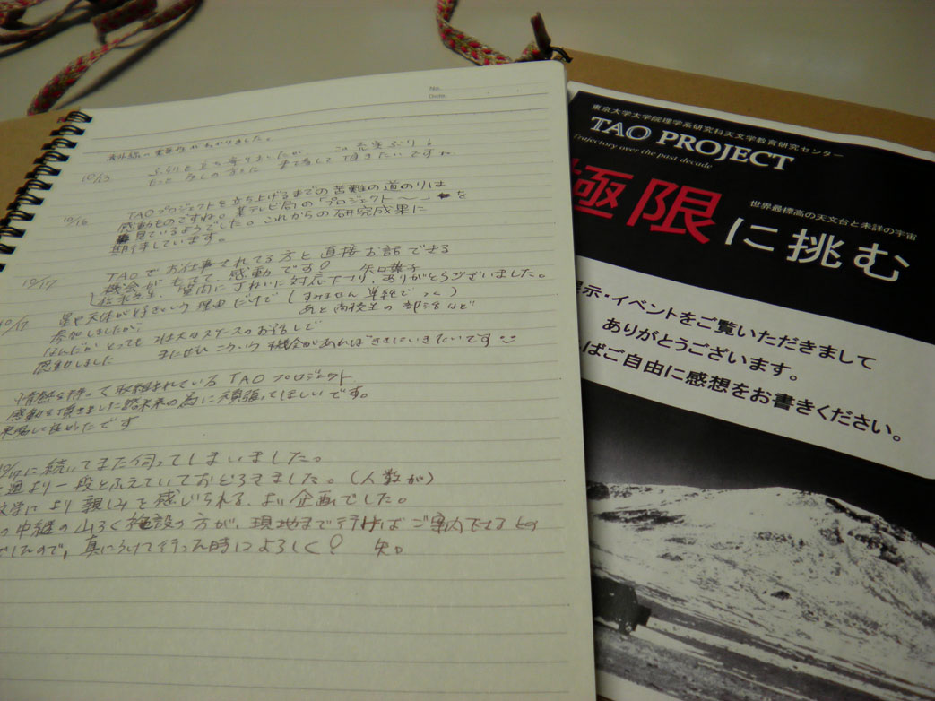 We received many impressions and comments on the notebook which we put in the venue of the exhibition and lecture. We realized that the TAO project was cheered and supported by many people.