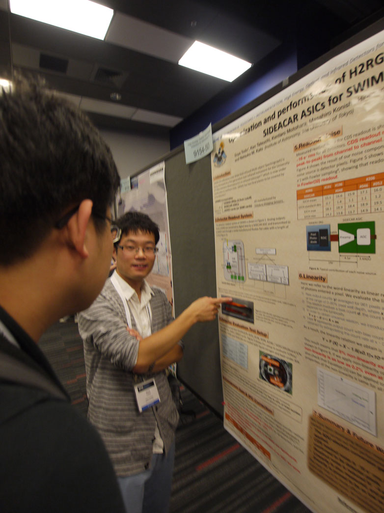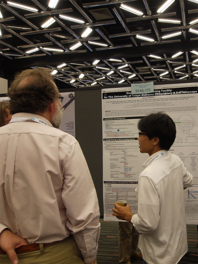 Presentation in SPIE2014 in June 2014The international conference on optics, SPIE (International Society of Optics and Photonics) was held at Montreal of The Province of Quebec, Canada on 22-27 June 2014, with an attendance of more than 2000. The SPIE is an international conference held every two years mainly in USA and Europe alternately. The forefront of technology is presented there on observations/measurements including astronomy, such as optical elements, optics, detector, telescope, control system, and read-out device. Many sessions relating to astronomy are going on in parallel, including optical/infrared instruments in space, X-ray technics, instruments on the ground, submillimeter/radio instruments, and so on. Attendants are not only astronomers, but also engineers, people in manufacturer, project managers, etc. Since 2008 we have presented the progress of TAO project at all SPIE. Please see the list of papers below.