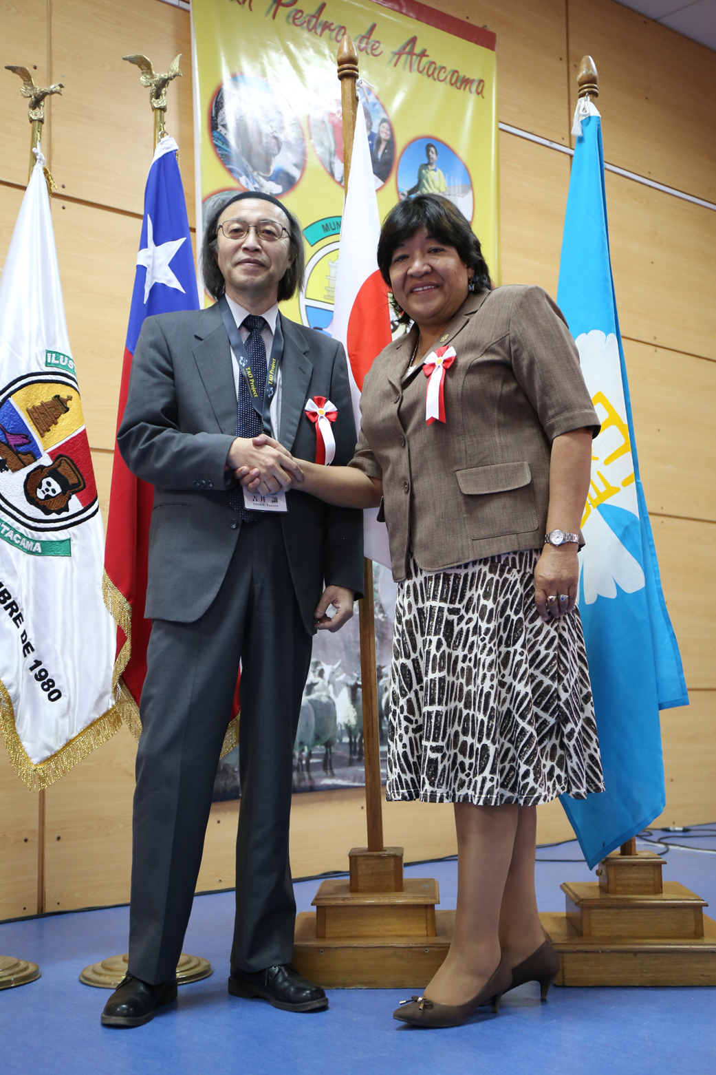 On November 21, 2014, the inauguration ceremony was held at the public hall in San Pedro city, and a total of 42 people attended the ceremony; from the University of Tokyo, Embassy of Japan in Chile, San Pedro city, ALMA and other peripheral astronomical projects, Japan and local companies and so on. At the ceremony, a letter of appreciation was given to the construction company of San Pedro City, SEKAI M.Z., KOKUSAI LAND • DEVELOPMENT CO., LTD., Andes Shoji Chile S.A., companies which contributed to the construction of the facility.