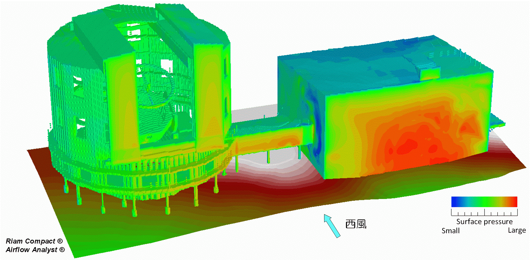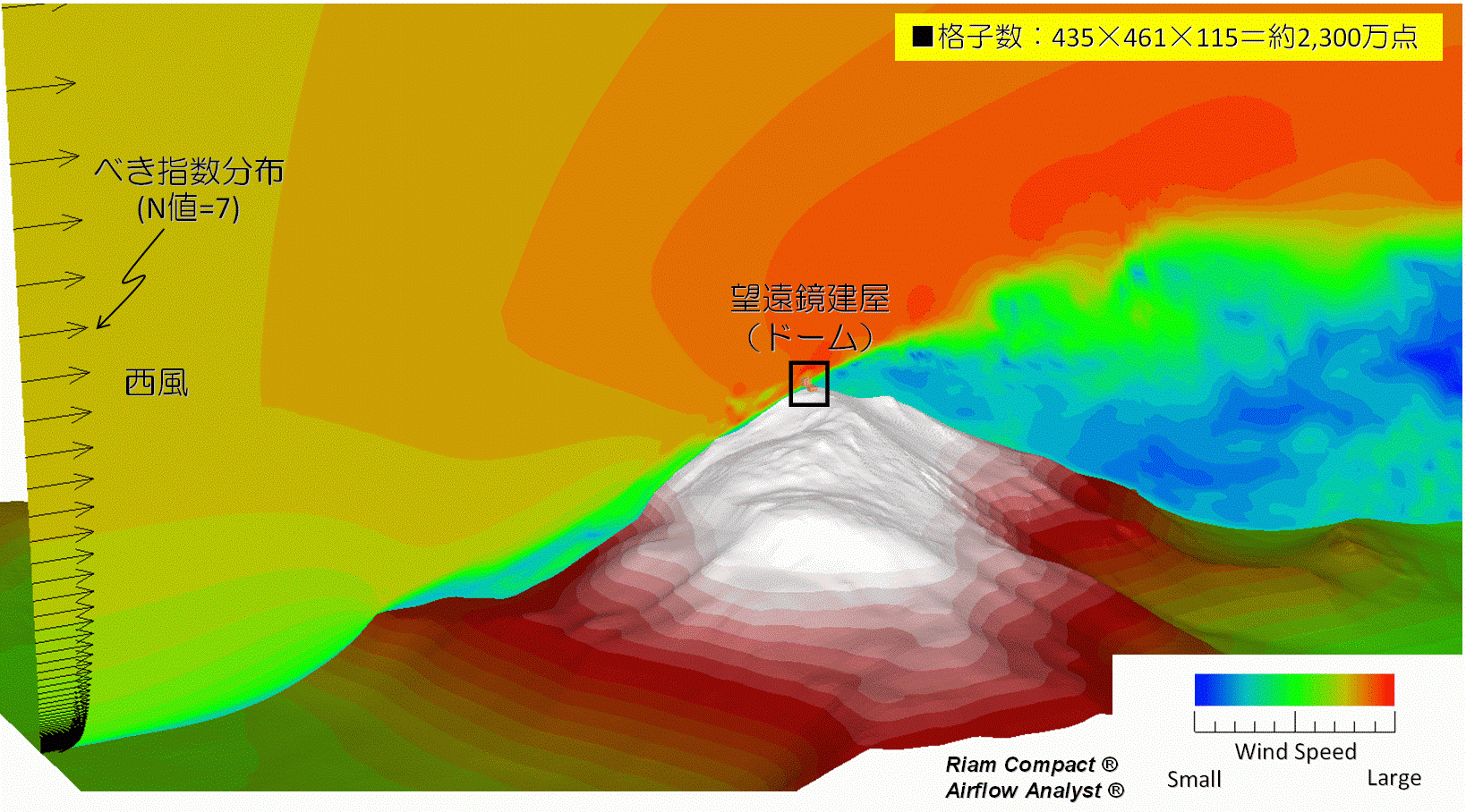 Succeed in predicting complicated wind behavior around the telescope enclosure in the collaborative study with Kyushu University and Environmental GIS Laboratory Co. Ltd.!As a research collaboration with the Research Institute for Applied Mechanics (RIAM) at Kyushu University and Environmental GIS Laboratory Co. Ltd., a large-scale numerical simulation has been successfully performed to predict and visualize the complicated wind distributions around the top of Cerro Chajnantor including the telescope enclosure and the operation building. When designing a telescope enclosure, it is important to predict wind conditions around the enclosure which affect the scientific data quality. The enclosure design of the TAO 6.5-meter telescope is currently being elaborated so that the telescope provides stable performance. This successful achievement enables us to predict the wind conditions in detail according to the form of the enclosure. The best enclosure design will be obtained after multiple simulation runs with a variety of enclosure forms. This numerical simulation can also be applied to control the wind condition during scientific observations. Such wind control, based on the numerical prediction, will be essential to optimize opening of the ventilation windows for the scientific operation of the 6.5-meter telescope. Research OutlineDr. Takanori Uchida, Associate Professor at Research Institute for Applied Mechanics (RIAM), Kyushu University, has successfully performed a large-scale numerical simulation for the enclosure of the TAO 6.5-meter telescope using a suite of computational fluid dynamics (CFD) codes (RIAM-COMPACT®) on a vector super computer at RIAM. The airflows moving around the telescope is an important factor which affects the quality of astronomical data because observations from the ground are always carried out through the atmosphere. For example, air turbulence caused by the difference in temperature between the atmosphere and the telescope degrades the astronomical image. Even though the TAO 6.5-meter telescope has the world's highest level of observation performance, it is still necessary for achieving stable and maximum performance to control the wind conditions inside the enclosure during observations, as well as to optimize the form of structures associated with the telescope. In addition, snow accretion on the structures caused by bad weather condition would prevent quick recovery to normal operation. To address these issues/problems, we used the Geographical Information System (GIS) to reconstruct three-dimensional object models of Cerro Chajnantor, the telescope enclosure, and the operation building.