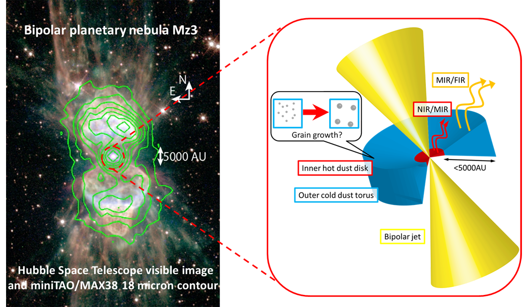 Left figure: A bipolar planetary nebula Mz 3 image obtained by Hubble Space Telescope at visible wavelength. The green contour line shows mid-infrared emissions at 18 micron obtained by miniTAO / MAX 38. Right figure: An imaginary view around the central star of the bipolar planetary nebula obtained from this study. It suggests the existence of a compact and dust torus spreading at a wide angle.