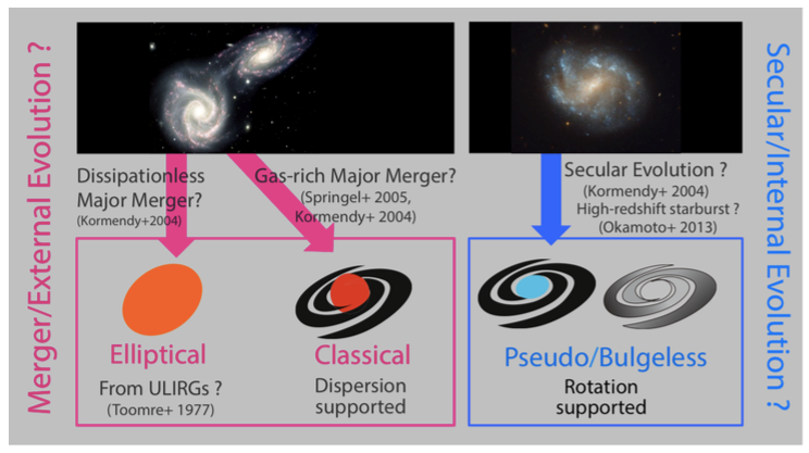 A diagram summarizing two theoretical predictions of the evolution of bulges. The left figure (pink) shows a scenario where a classical bulge is formed through a galaxy collision, and the right (blue) a scenario where a disky bulge (Pseudo bulge) is formed secularly without strong interaction.