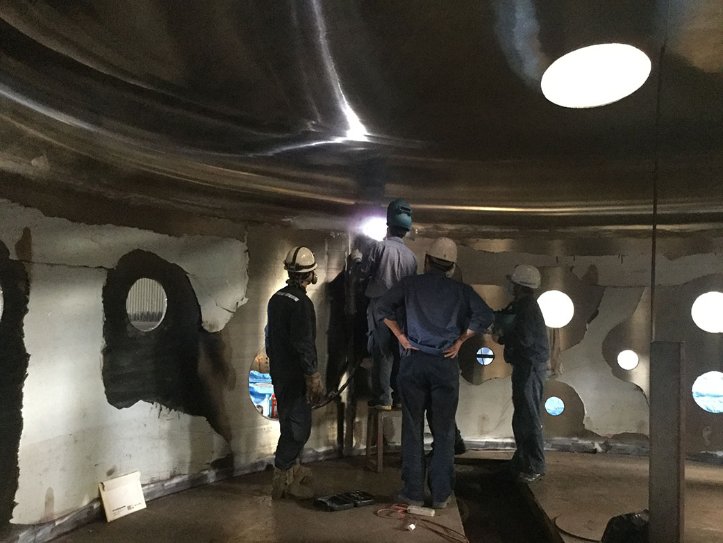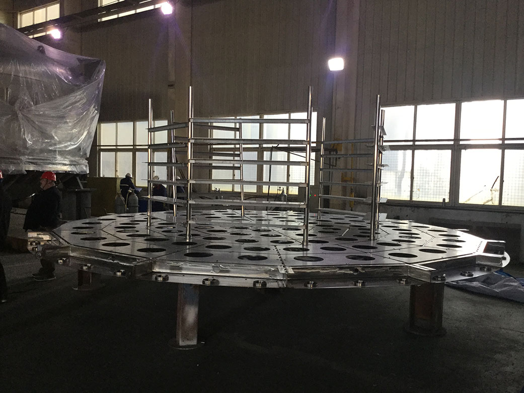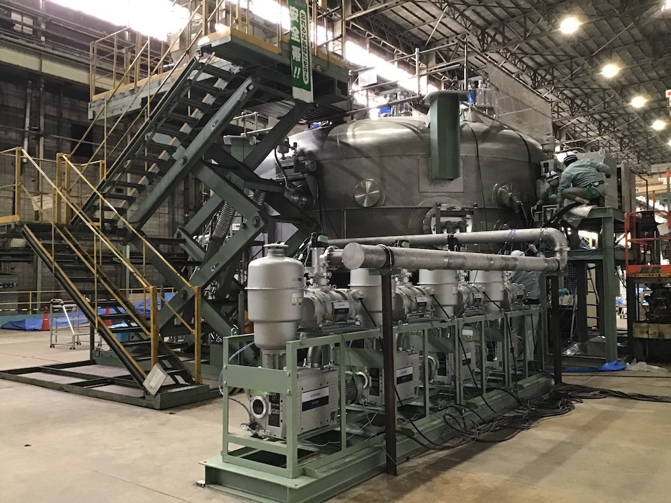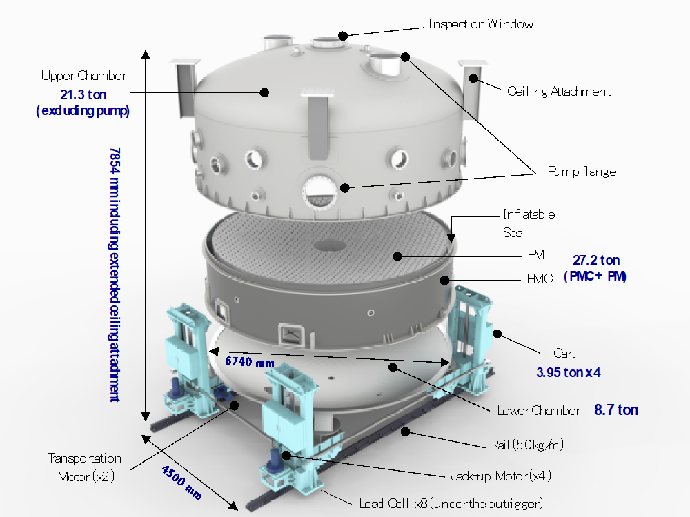 Fabrication of the Deposition ChamberThe conceptual design of the coating system was started from 2015, continuously performed basic design such as material selection, strength calculations, and performance evaluation of attached equipment. Afterwards, we proceeded to consider of machining tools and processing methods. Fabrication of the chamber started in 2018, when the detailed design was almost finalized. In addition to the main chamber, we made various flanges, scaffolding of deposition equipment in the chamber, storage boxes of filaments, and weight shelves for the attached equipment. Coating to the primary mirror is performed in the chamber which in vacuum drawn inside. Due to the property of the evaporation vacuum vessel, which must not damage the primary mirror, welding defect must be absolutely avoided. Therefore, each part of the chamber, made entirely of stainless steel, was carefully checked and welded during the manufacturing process. After about a year of manufacture, during which we repeatedly considered the processing and holding methods, we were finally able to see the completed coating chamber. Despite maximum diameter of the chamber is nearly 7m, its accuracy was less than 0.5 mm, that is fully satisfying the specifications.