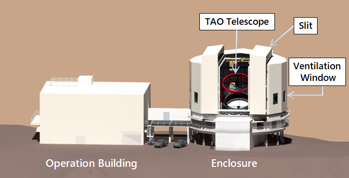 Preliminary assembly test of the TAO operation building has been completedOperation building of the TAO telescopeAt the summit of Co. Chajnantor (altitude 5640 m), the enclosure protecting the TAO telescope from harsh natural environments and the operation building with a facility to perform observation and maintenance will be constructed (Fig. 1). The enclosure is a cylindrical building which is 25 m in diameter and 24 m high, and the TAO telescope will be installed on an independent foundation placed in the center. The top of the enclosure can be rotated horizontally, and the celestial objects are observed through opening and closing doors (slits).