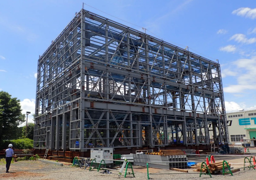 Preliminary assembly test in JapanStructural components of the operation building, including steel frames and walls, were manufactured in Japan. In order to carry out construction work reliably and smoothly in a harsh environment at an altitude of 5,640m, we decided to make a preliminary assembly of steel components for the operation building in Japan. Preliminary assembly tests of steel components of the operation building were conducted in Kazo City, northern Saitama prefecture, starting in May 2020. Most of the steel frame members were assembled, and the accuracy and strength of the joints and the dimensions were checked. We also checked the accuracy of the joints with non-steel frame components. (Fig.2, Fig.3)
