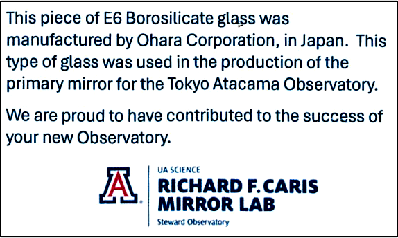The highlight of this exhibition is a piece of borosilicate glass gifted by the University of Arizona, which commissioned the design and production of the primary mirror. To celebrate the TAO telescope site completion ceremony, the surface of each piece of glass on display is engraved with the TAO project logo and the date of the ceremony, "April 30, 2024". The gift is accompanied by the following message card.