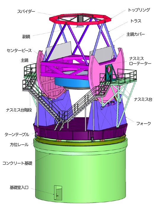 6.5m望遠鏡TAO望遠鏡は口径6.5mの主鏡を持つ大型望遠鏡で、標高5,640mという標高を活かしつつ効率的な観測を行うため、 (1) 水蒸気量が非常に少なく、高感度の赤外線観測に設計されている、 (2) 装置の取り外しや交換などを行わない、また山麓施設からの遠隔観測によって、メンテナンス・運用へ配慮、 (3) 経済性を考慮したコストパフォーマンスの高い設計、 という特徴を持っています。 TAO望遠鏡には3つの焦点があり、各焦点には観測装置が搭載されます。 望遠鏡や観測装置には多くの最新技術が導入され、世界最高性能の観測を行います。 鏡主鏡TAO 望遠鏡の主鏡にはボロシリケイト (オハラ社 BSC ガラス) のハニカム軽量鏡が用いられます。 これはアリゾナ大学 Mirror Lab. で開発されたもので、自重を支えるのに十分 な厚み (外周厚み 71cm, 内周厚み 39cm) を持ちながら、 ハニカム構造によって重量を極限まで小さくしています (口径6.5m、重量8.3t。銀でコーティング。) 主鏡 F 値は 1.25 と 非常に速く、望遠鏡鏡筒を短くし望遠鏡・ドームをコンパクトに納めることに貢献しています。 このような速いF 値の望遠鏡を実現するため、回転するテーブルの上で鏡材を成形する方法 (spin cast 法) によって主鏡は製作されます。 副鏡TAO 望遠鏡では赤外観測性能を高めるため赤外線観測に最適化した副鏡を用いられます。 すべての観測装置で共通に使用し, 観測モード変更による副鏡交換は行わなわず、これによって副鏡支持構造の簡素化、運用の負担を低減を 実現します。さらに、高速アクチュエータにより表面形状を変えることのできる最新技術が導入される予定です。 この機能は、補償光学 (AO:Adaptive Optics) 装置と組み合わせて使われ、大気のゆらぎを補正しシャープな画像を得ることができます。 観測装置ナスミス焦点 中間赤外分光撮像装置MIMIZUKU