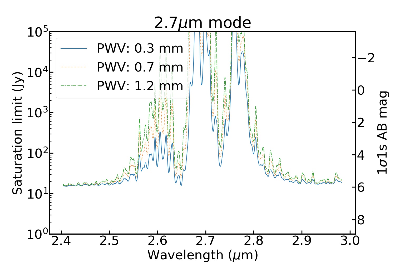 Saturation limits depend on wavelength as shown in the figures below, and the typical levels are summarized in the table below. In the water-vapor-absorbing bands, the saturation limits vary with PWV.