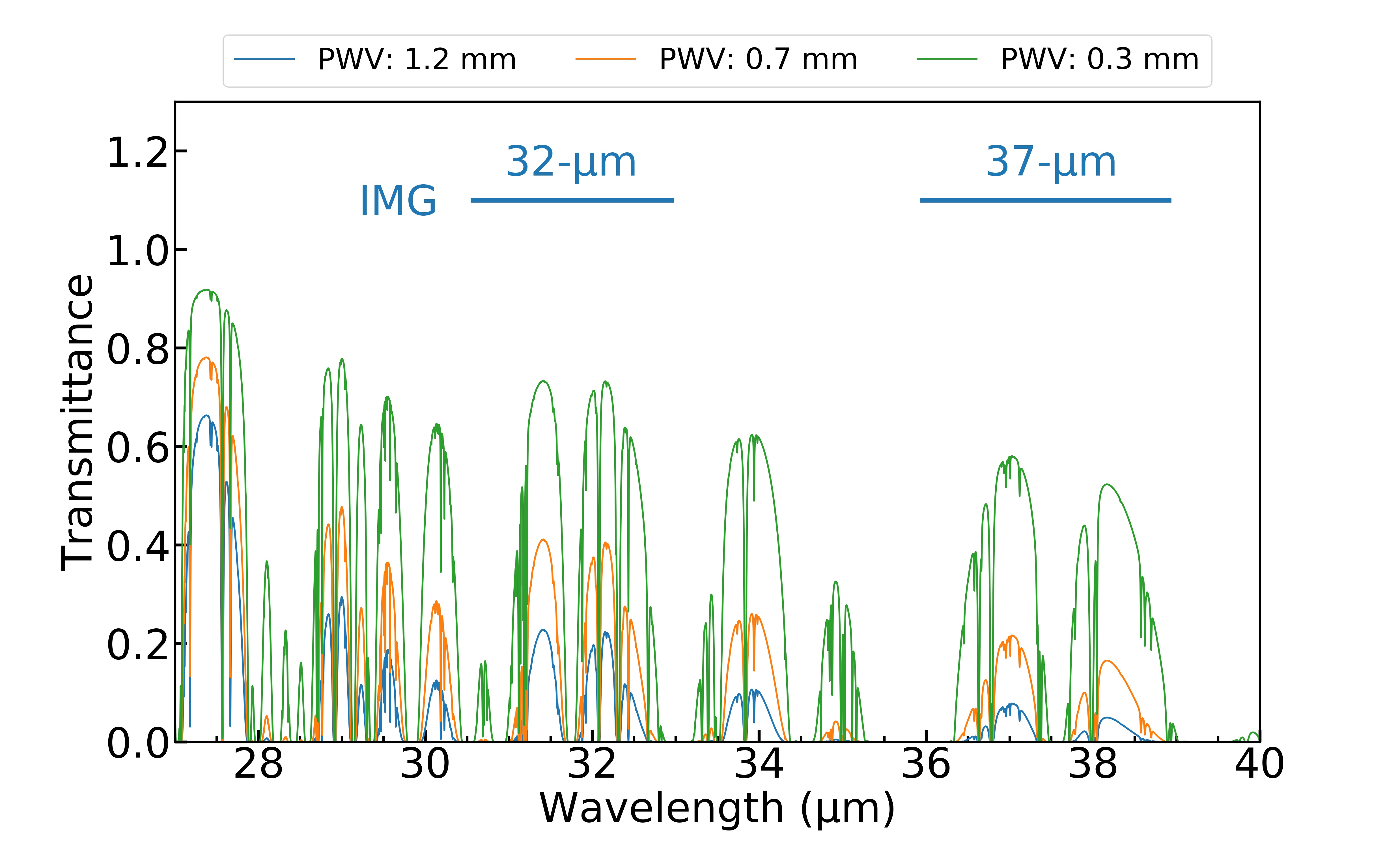 Available modes and atmospheric transmittance smoothed with a Gaussian profile with an FWHM of 0.002 um-1.Atmospheric transmittance covered by the 2.7-um spctroscopy mode smoothed with a Gaussian profile with an FWHM of 0.00056 um-1.