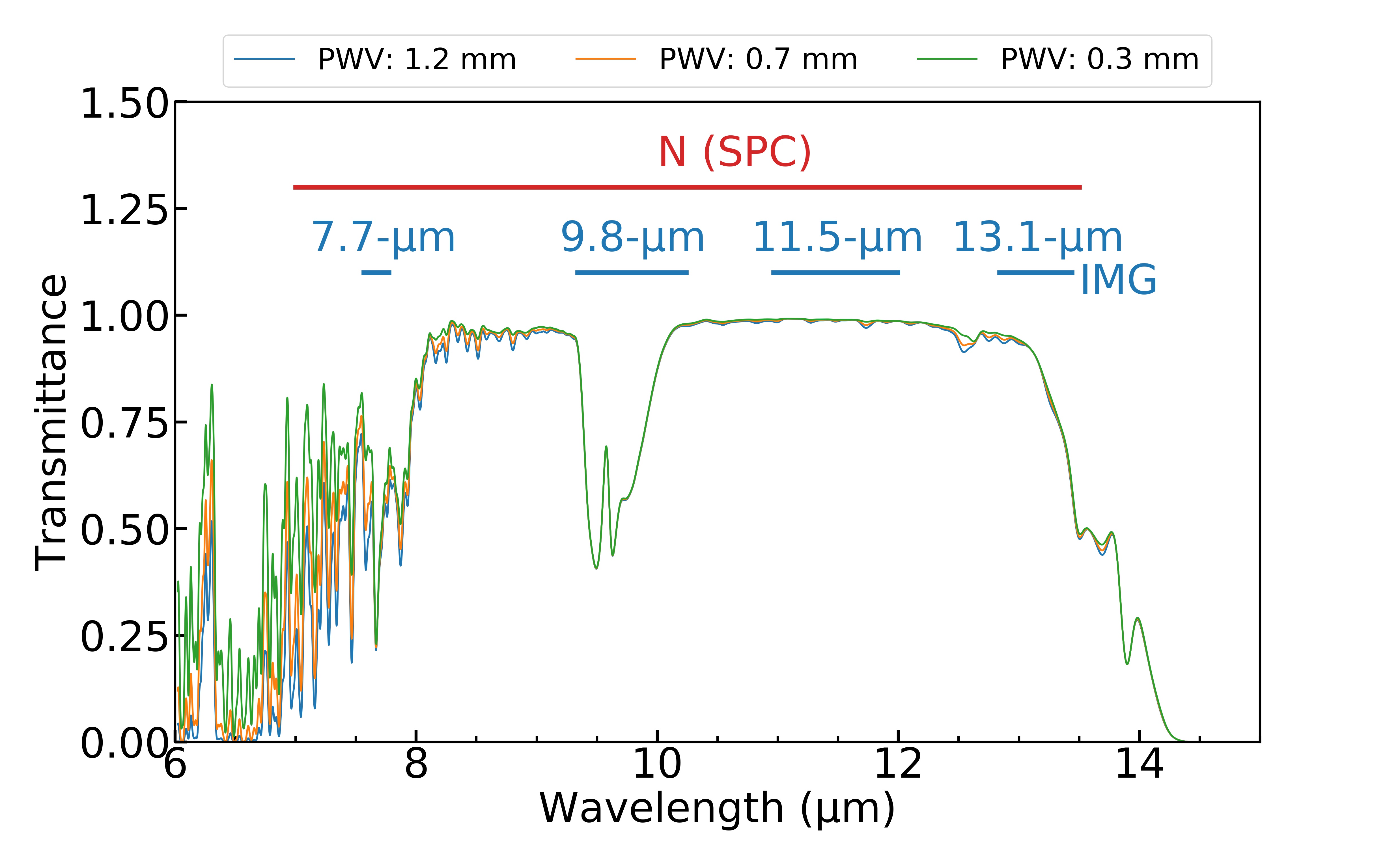 Modes in 30-um band and the atmospheric transmittance.