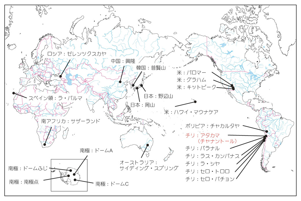 このような理由から現在大口径の望遠鏡を持つ観測施設は、いくかのサイトに集中しています。この中でもチリ・アタカマ高原はその標高と乾燥した環境から、天体観測に最も適した場所と言われています。