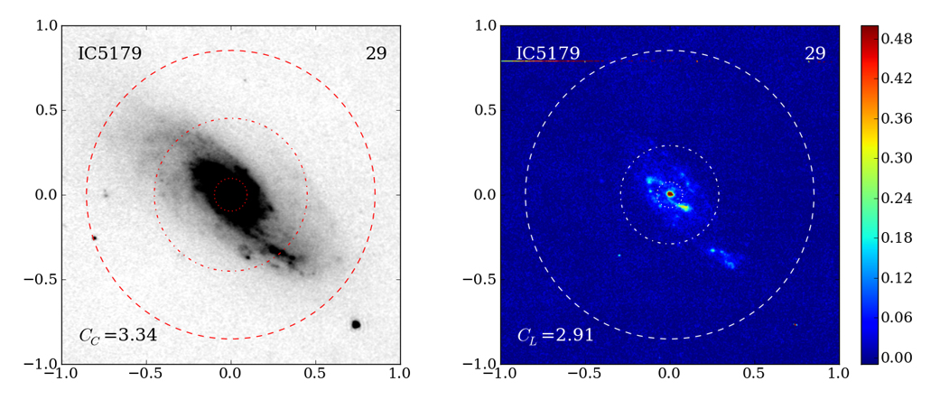 これまでの多くの大規模な深宇宙探査により、過去に向かうほど宇宙の星形成活動が高まっていくことが分かってきました。さらにこうした活動の大部分は、超/高光度赤外線銀河(U/LIRGs)により担われていたことが明らかとなってきました。しかし、これらの銀河がどのようなもので、活発な星形成がどのように引き起こされているかについてはまだよくわかっていません。それは、遠方(z>1)での詳細な観測が現在の技術ではまだ難しいためです。そこで内部分構造を空間分解できる近傍(z<0.1)の観測から、遠方ではとらえられない詳細な星形成活動を明らかにすることで、銀河進化の理解に迫ってゆくのが本研究の目的です。 U/LIRGsの星形成活動を詳細に研究するには、直接的な星形成指標であり、ダスト減光に強く、放射強度が強い水素再結合線Paα(パッシェンアルファ)輝線(1.875micron)が適しています。しかしながら、Paα輝線のある波長域はちょうど地球の大気吸収が激しい波長であり、地上からの観測は困難であると今までは考えられていました。 Atacama Near InfraRed camera:ANIRは、南米チリ・チャナントール山山頂の標高5640mに設置されたminiTAO 1m望遠鏡に搭載されている近赤外線カメラです。このサイトは、非常に高い標高と低い水蒸気量(PWV〜0.5mm)のおかげで赤外線域の大気の窓が通常よりも大きく開くため、Paα輝線の狭帯域撮像観測を安定して行うことが可能となっています。さらに、高い晴天率(80-90%)や良好なシーイング(中央値で0.8秒角以下)にも恵まれ、こうした赤外線観測を行うには非常に適したサイトとなっています。本研究ではこのANIRを使い、ANIRのN191フィルター(1.9micron)にPaα輝線が入ってくる近傍(2800km/s < cz < 8100km/s)LIRGsのPaα輝線観測を行いました。全部で38天体のLIRGs及びそれに準ずる赤外線光度を持つ銀河のPaα輝線観測を行いました。ダストに埋もれた星形成を直接空間分解してその活動度を求め、それと中心集中度を指標とした個々の銀河の形態との関係を明らかにしました。結果、Paアルファ輝線から求めた星形成活動度と中心集中度の相関関係として、2つのモードがあることを発見しました。そのモードとは、銀河の星の分布と星形成領域の分布が楕円銀河のような形の「コンパクトモード」と、銀河の星の分布が渦巻き、または不規則銀河的である「ノーマルモード」です。これらのモードの違いについては、何が要因となっているか今後詳細に研究し明らかにしていきます。 |