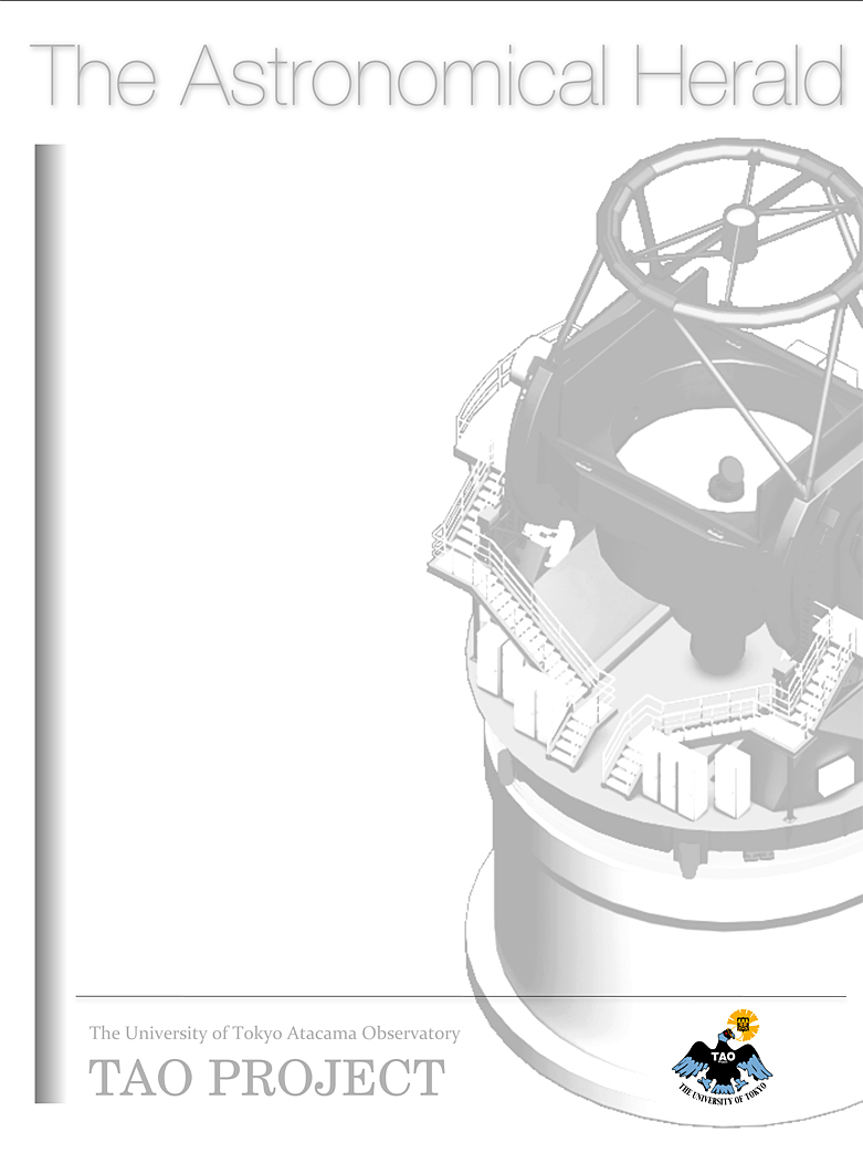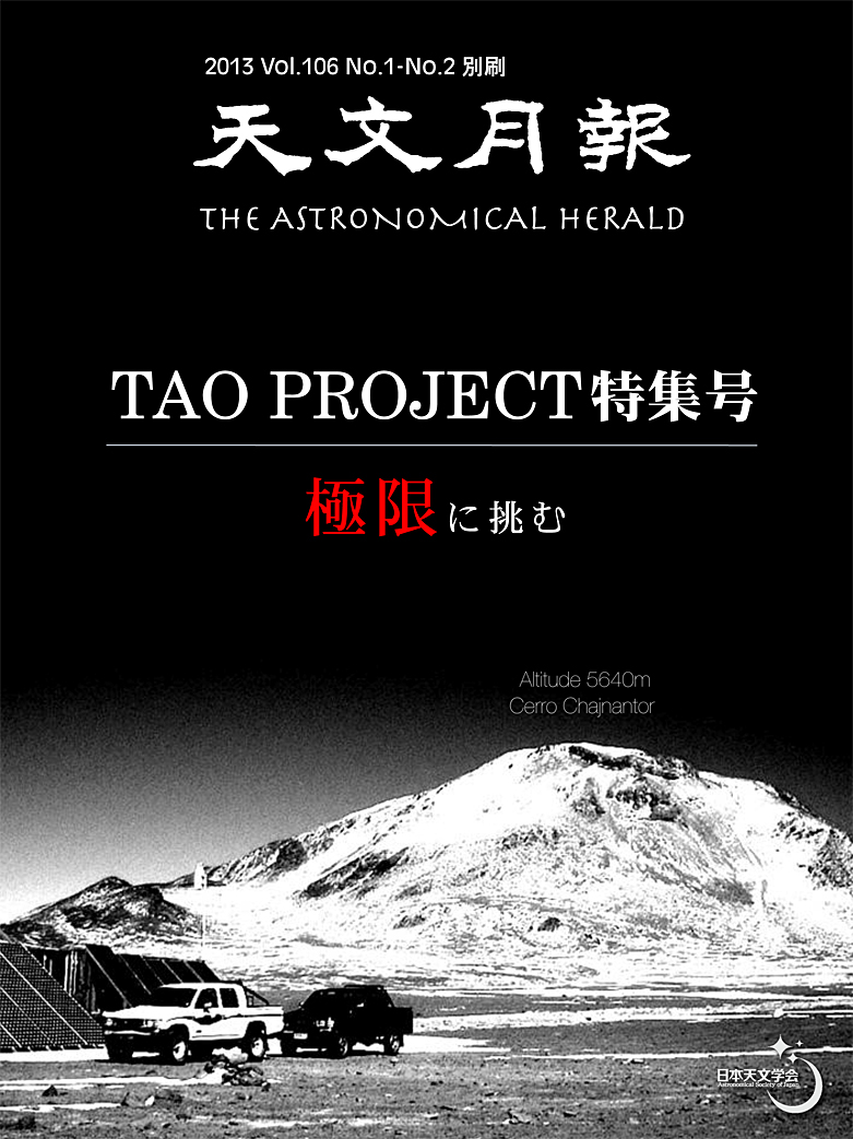日本天文学会誌天文月報にTAO特集記事!日本天文学会では、月に1回天文月報を刊行しています。 その内容は最新の研究や解説記事の他、書評、海外渡航記事、 天文学研究に関する情報提供などです。また、研究記事として 不定期にプロジェクト特集も掲載されることがあります。 天文月報 TAO特集号(2013年1月号、2月号)TAOプロジェクトは、これまでにminiTAOの観測成果も多く出され、学術論文も出始めています。そこで2013年1月号と2月号の2回にわたり、天文月報にTAO特集が組まれることになりました。各月ともに4編づつの学術記事、さらに1月号には巻頭グラビアとしてminiTAO望遠鏡や建設の様子、観測やその結果などのカラー画像が4ページに渡って掲載されました。 天文月報 別刷上記の特集に先だって、2004年9月号にTAOサイト調査の記事が掲載されています。