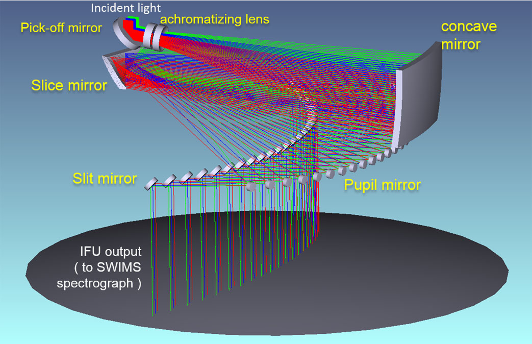 そのような観測を実現するために用いられるのが、面分光ユニット(Integral Field Unit)と呼ばれる光学系です。本研究ではSWIMS(スイムス)と呼ばれる装置に収納する面分光ユニットを開発しています。SWIMSはTAO6.5m望遠鏡の第1期装置で、すばる望遠鏡にも搭載して観測できるようになっています。本来は近赤外域の波長で撮像と多天体分光ができる装置ですが、私の研究はそこに面分光観測モードを追加することで、上に述べた銀河形成進化の謎を解き明かしたいと考えています。