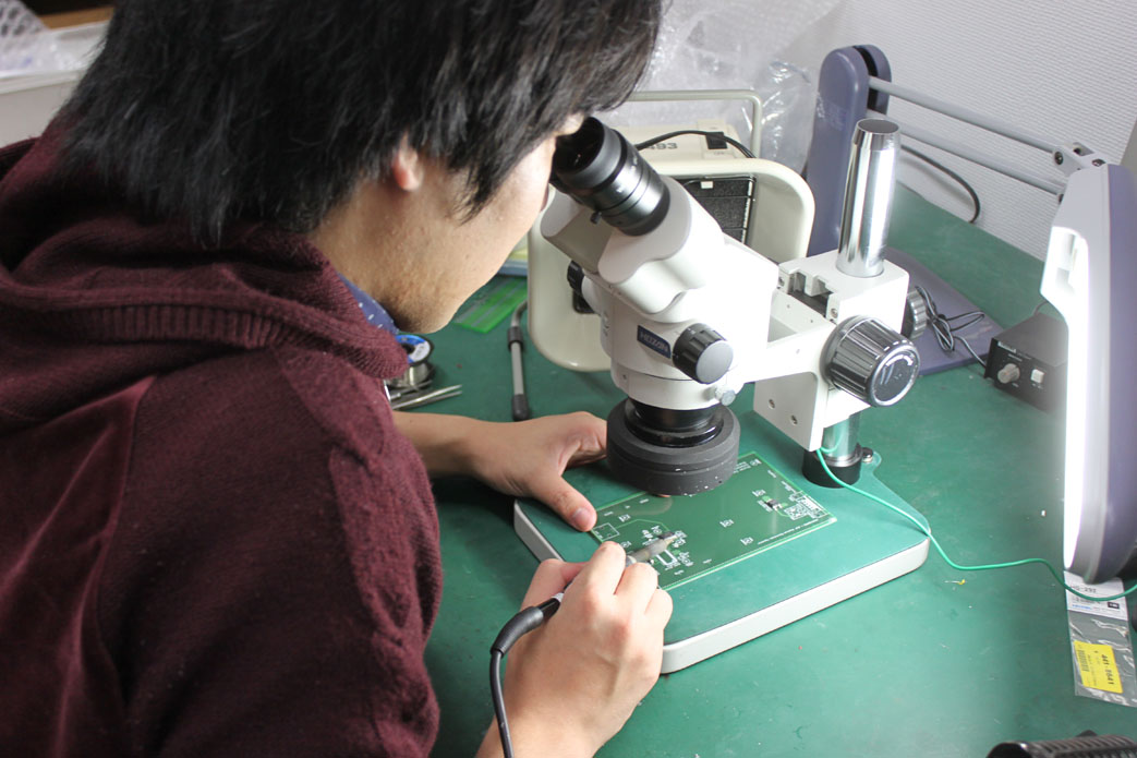 ▲ 低温ソースフォロワーの実証試験用回路基板作成作業の様子