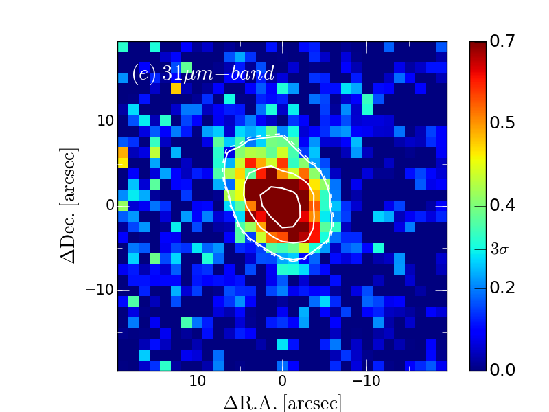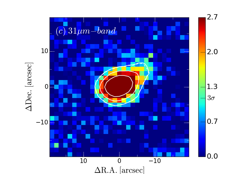 本研究で我々はこの問題を解決する為に、中間赤外線観測装置MAX38の製作を行い、中間赤外線観測の大敵・水蒸気が地上で最も低いアタカマ砂漠の標高5,640mチャナントール山頂に設置したminiTAO望遠鏡に取り付けて2009年のファーストライト以降、現在まで述べ現地滞在期間300日弱という長期間の観測を行ってきました。南天で最も明るい双極状惑星状星雲のNGC6302, Mz3, Hb5 の3天体を18, 25, 31, 37 micronという長波長の中間赤外線で撮像観測した結果、3天体全てにおいて低温の塵の大部分が中心星から5000AUよりも狭い範囲に、厚いトーナツ型のトーラス構造で存在する事が明らかになりました。また、赤道面へ現在まで想定されていた放出量の100倍程度の非常に強い質量放出が起きていたことも明らかになり、過去に赤道面へ選択的に塵の放出が起きた事で双極状形状の形成が起きた可能性を示唆する、恒星進化においても重要な研究となっています。