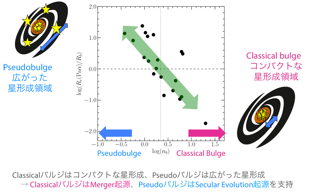 人間の顔が一人一人違うように、銀河も多種多様な顔(形態)を持つ。こうした多様性がどう形成・獲得されてきたかの解明は、銀河の形成/進化をひも解く上で重要であり、天文学史上基本的かつ最大の課題の1つである。伝統的な形態分類学は、銀河を見た目で「楕円銀河」と「渦巻銀河」の2種に大別し、その進化過程を「ハッブル分類」に沿った統一モデルで説明しようとしてきた。ところが、それらの進化過程は別物とする観測・理論的示唆が多数報告され、広く支持されるようになってきた。そこで近年、新しい切り口として「物理的形態分類学」が注目されている。これは、見た目の形態で判断するのではなく、銀河にかかる内的/外的力学作用を軸に据えた分類法である。この分類法では、銀河の形態史をよく反映していると考えられる「バルジ」に注目し、その力学運動が“分散/回転運動”のどちらが卓越しているかで、渦巻銀河のバルジを古典バルジ(Classical bulge)と円盤バルジ(Pseudo(disk) bulge)の2種に新しく大別する。観測的には、バルジ表面輝度プロファイルのSérsic-Indexが、「2未満なら円盤バルジ」、「2以上なら古典バルジ」と区別できることが知られている(Fisher et al. 2008)。こうした形態形成について、理論研究からは、(1) 楕円銀河:銀河衝突/合体による形成、(2) 古典バルジ:銀河が衝突/合体を経験し、その後円盤が形成、(3) 円盤バルジ:外的作用を受けない自立進化による形成、というシナリオが提案されている(Kormendy et al. 2004)。