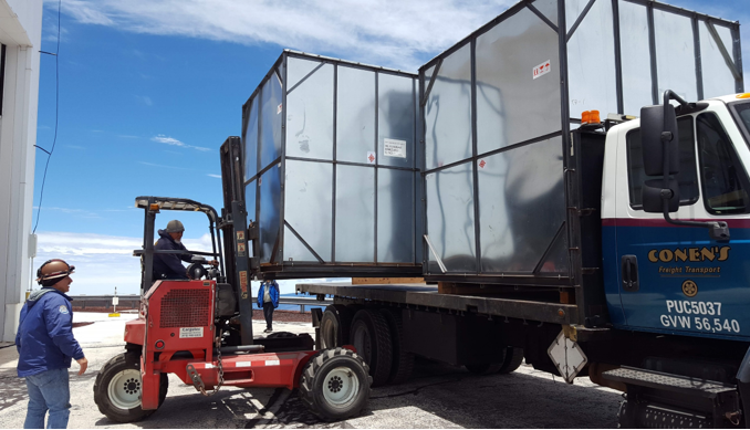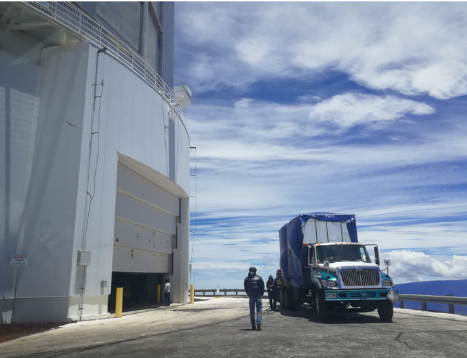 2018年時点では、MIMIZUKUはハワイにありました。しかしハワイでは継続的な開発作業は難しく、また新規装置受け入れで大忙しのハワイ観測所に迷惑がかかります。一方でTAOの山麓実験棟の完成までまだ時間がかかるということもあり、MIMIZUKUを一旦日本へ輸送し、東京・三鷹の天文センターにて開発を再開することにしました。このため、2019年6月にはすばる望遠鏡のあるマウナケア山頂からハワイ観測所山麓施設のあるハワイ島ヒロへ輸送(図2)。続く10月にはハワイ島から日本への海運輸送を開始。そして12月26日に無事、三鷹の天文センターに到着しました(図3)。この一連の作業には、ハワイ観測所の方々、天文センター所属の大学院生諸氏(橘氏・紅山氏・櫛引氏)、助っ人として駆けつけてくださったMIMIZUKU開発チームOBの内山氏など、多くの方々のご協力をいただきました。ここにその感謝を表します。