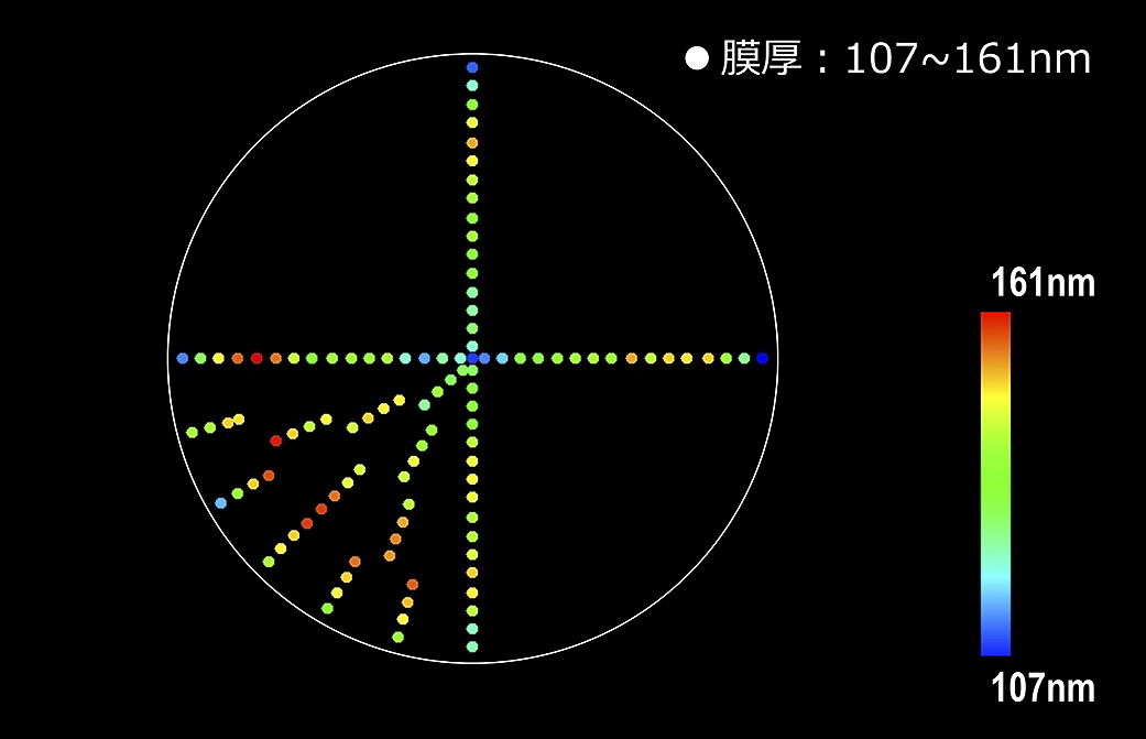 蒸着試験TAOの蒸着装置では147本のフィラメントを4系統の電源で制御します。フィラメントに含浸しているアルミニウムを効率よく、均一に蒸発させるために、プレヒーティング、第一発火、第二発火の3回に分けて電流(電圧)を印加して、蒸着が実行されます。複数回の蒸着試験の結果、膜厚はやや厚めの箇所があるものの最低でも100nm以上あり、赤外線波長での観測には問題ない値となりました。また、アルミ含浸量を内周と外周で異なる値のフィラメントを配置することで、膜厚が一定の範囲内に収まることを確認しました(下図)。