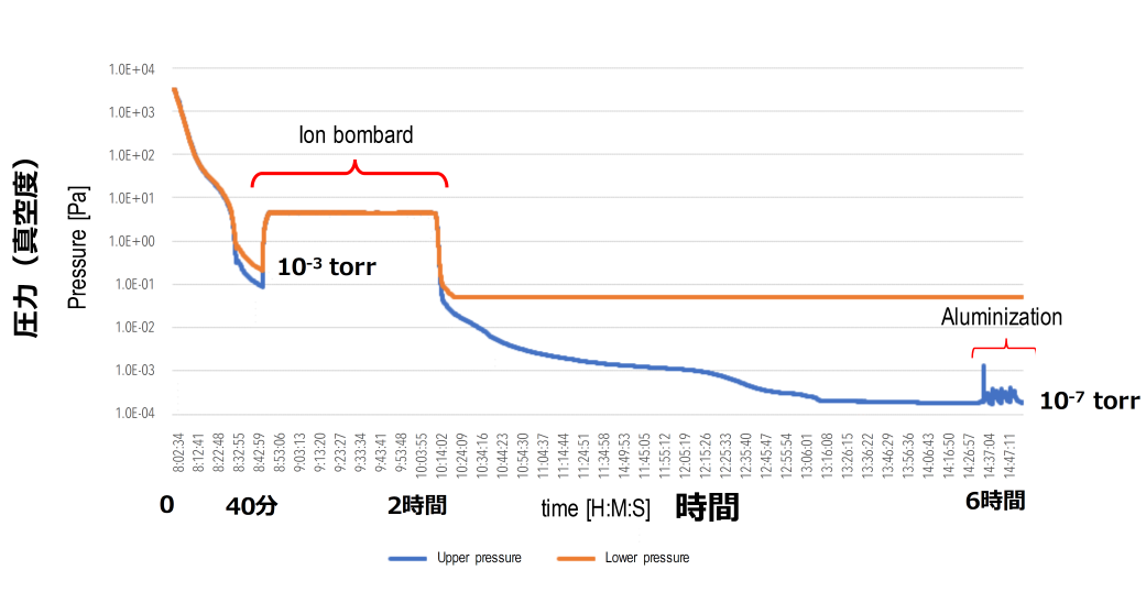 蒸着試験の概要蒸着プラントの各パーツは国内外で製作されました。メインの蒸着チャンバーは製造元で形状や真空容器としての機能などの構造チェックを受けたのち、蒸着総合試験場所である横浜に移送されました。他、真空ポンプや制御装置なども完成後、続々と横浜に集結し、2020年前半に、これらコンポーネントの設置、設計案を基にした配管・配線接続を行い、各装置の起動・基本動作試験および、蒸着システムとしての総合試験が行われました。(概要については2020年4月15日の記事を参照ください。) 今回の記事では、その試験結果の詳細について解説します。試験内容としては、(1)真空チャンバーとしての到達真空度、到達時間の測定、(2)鏡洗浄後蒸着直前に行われる鏡面上の酸化膜の除去、分子レベルの洗浄のためのイオンボンバードに必要な封入ガスの選定、電流・電圧の最適パラメータ導出、(3)金属蒸発時の印加電流・電圧値、印加のタイミング、継続時間などの最適値の導出などです。
