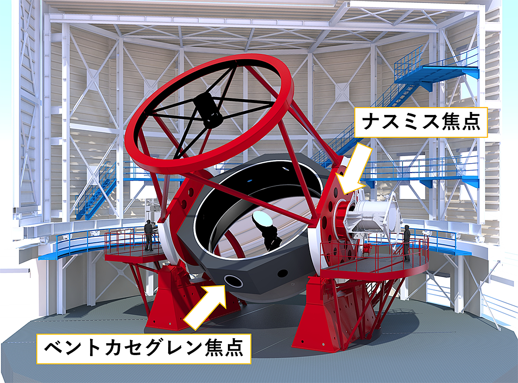 ▲図1: TAO望遠鏡のナスミス焦点とベントカセグレン焦点。それぞれ逆サイドにも設けられている。