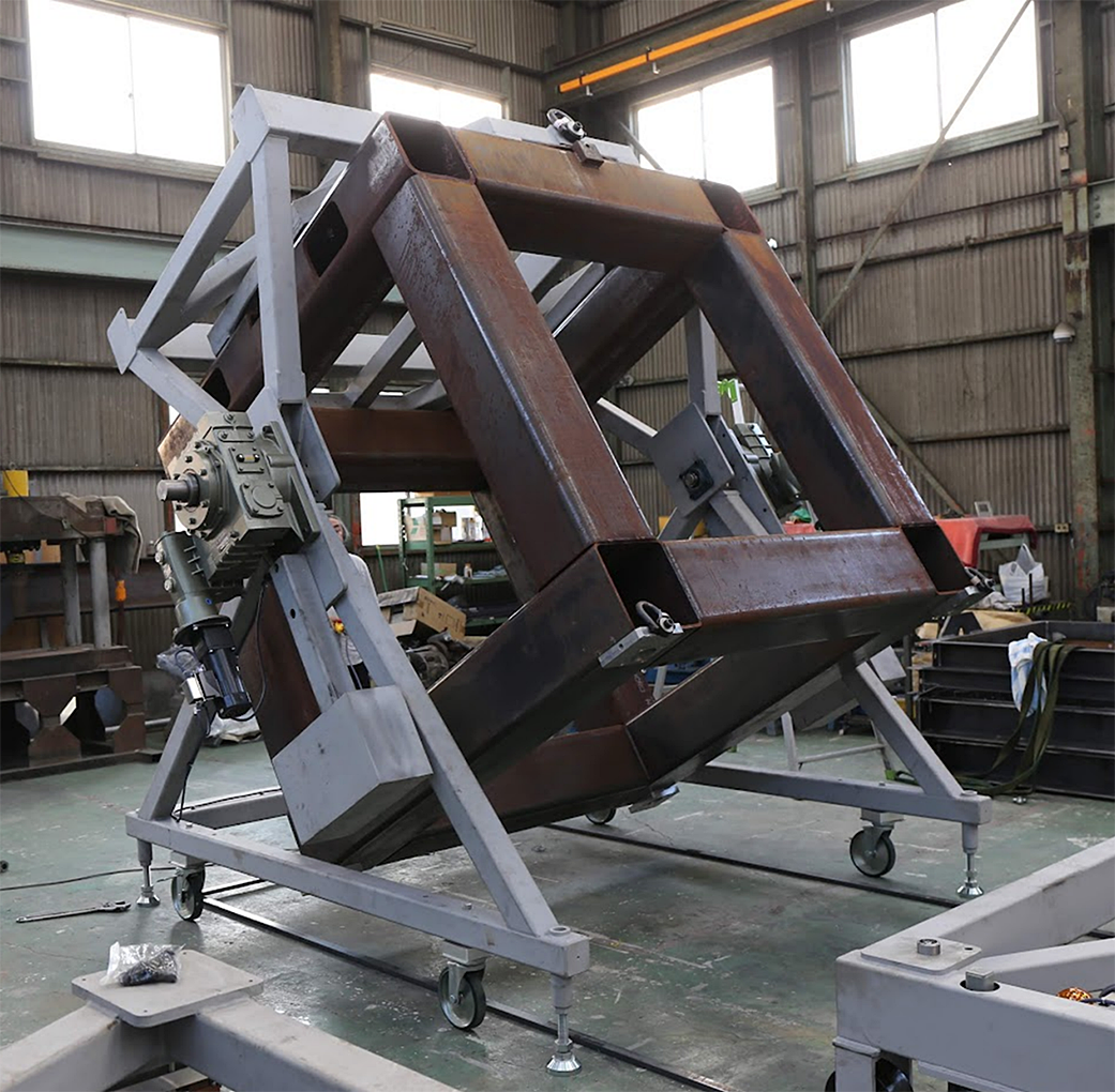 SWIMS・MIMIZUKUは、移動台車搭載時の観測装置の姿勢を縦向きとすると、望遠鏡搭載時の姿勢はこれを90度回転させた横向きの姿勢となります。このため、これらの大型装置は取り付けの前に、安全に90度回転させる必要があります。回転台車はこの回転動作を安全に実現します。図3は観測装置の重量とサイズを模擬した観測装置ダミーを回転させている途中(約45度回転させた状態)の回転台車の様子で、このような動作によって観測装置を縦向きから横向きに、あるいはその逆に姿勢変更を行います。この操作は望遠鏡の周りの床で実施し、望遠鏡搭載に向けては、観測装置を横向きにした後にクレーンで観測装置を吊り上げ、取付台車に搭載します(図4)。