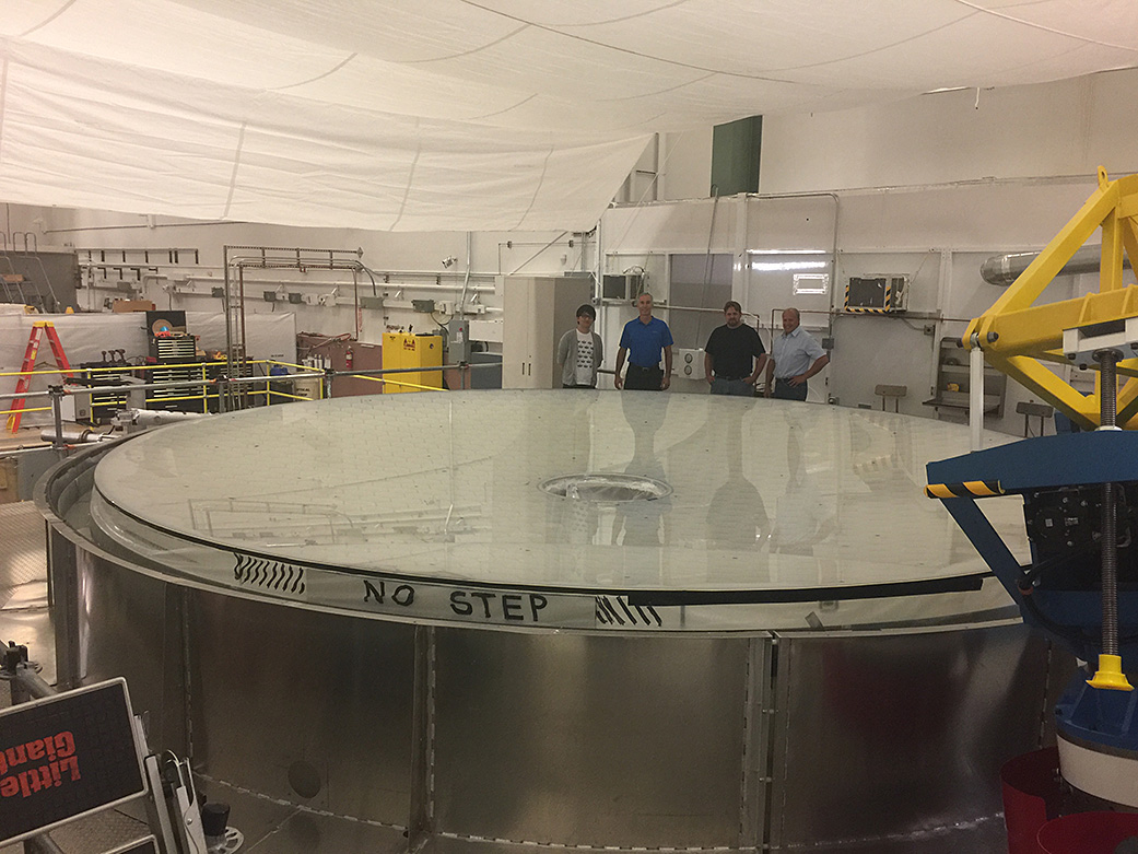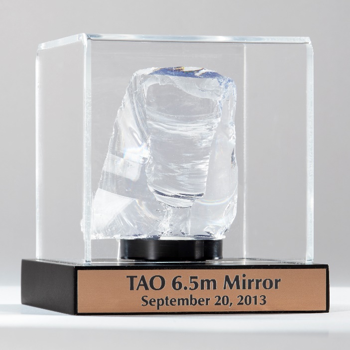 その後、アリゾナ大学はスチュワート天文台ミラーラボ (現在の名前はRichard F. Caris Mirror Lab.) という大型鏡開発・製作のための施設を設立し、ハニカム構造による大型望遠鏡用鏡の製作の世界的な第一人者として天文学をリードしてきました。その後も、直径6.5m、8.4mの大型鏡を次々と製作し、米国のLBT望遠鏡、チリ共和国のマゼラン望遠鏡等に使用されています。2023年には、8.4m鏡を用いたRubin Observatory Simonyi Survey望遠鏡が、2029年には既存の最大光赤外線望遠鏡を大きく上回る口径25m (8.4m鏡を7枚並べたもの) GMT望遠鏡が観測運用を開始予定です。これらの鏡には全てオハラ社のガラスが使用されています。 TAO望遠鏡の鏡もこのオハラ社のE6ガラスを材料としてミラーラボで製作されたハニカム鏡です。標高5,640mという世界最高標高の天文台という特性を活かすとともに、そのような高地での運用を容易にするため、私たちはオハラ社のE6ガラスを用いたアリゾナ大学製作の大型鏡を選択しました。 2020年1月には、鏡の性能試験が完了し、2022年2月現在、望遠鏡サイトへの輸送のため、アリゾナ大学にて保管されています。 2014年のアリゾナ大学の研究者の東京大学訪問の際には、アリゾナ大学研究者の強い希望でオハラ社への訪問が実現し、これまでのサポートへの敬意を評するとともに、様々な意見交換を行いました。私たちは、米国をはじめとする世界最先端の望遠鏡の鏡に、日本のオハラ社のガラスが使われていることを誇らしく思うと同時に、ミラーラボが愛してやまないオハラとともに、世界の望遠鏡史の1頁にTAOが加わることにこの上ない喜びを感じています。