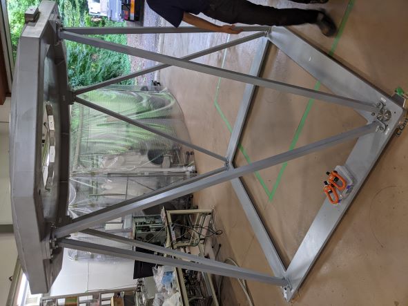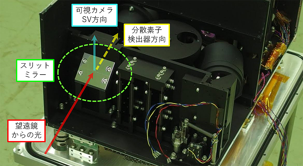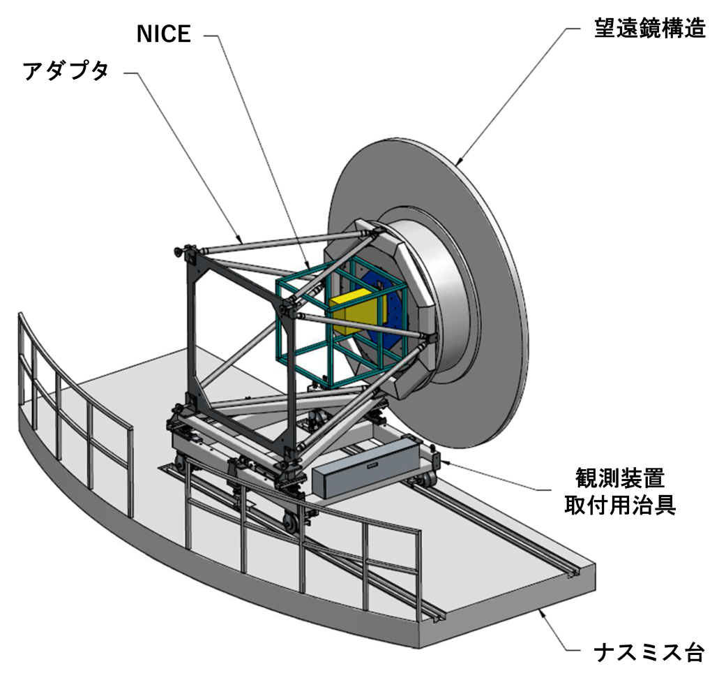 近赤外線エシェル分光観測装置NICE チリ出荷にむけて準備中NICE(Near-Infrared Cross dispersed Echelle spectrograph)はTAO望遠鏡にファーストライト用として搭載される予定の近赤外線エシェル分光観測装置で、2000年に天文学教育研究センターで開発されました。0.9〜2.5μmの近赤外線帯を観測波長とし、分光素子としてエシェル回折格子+クロスディスパーザーを採用した、波長分解能2600の分光装置です。分光だけでなく、J、H、Ksバンドの撮像も可能な観測装置となっています。 NICEは、これまでに国立天文台1.5m赤外シミュレータや北海道大学1.6mピリカ望遠鏡に搭載され、 様々なタイプの恒星や金星などの近赤外分光観測を行ってきました。例えば、炭素星や、黄色超巨星、Wolf-Rayet星といった恒星に対して近赤外線分光観測を行う事で、恒星の有効温度を決定したり、質量放出の様子を明らかにしてきており、その他金星観測では、近赤外分光観測と他の波長の観測結果大気モデルを併せて考えることで、分厚い大気の構造や運動などの物理状態の解明を進めています。 大気透過率が高いTAOサイトでは、0.9〜2.5μmの近赤外線波長帯において切れ目ないデータ取得が可能となる事から、これまでの研究以外にもより多くの研究が一層進む事が期待されます。 2018年のピリカ望遠鏡での観測運用終了後から現在まで、NICEはTAO6.5m望遠鏡第一期観測装置として改修、 開発が進められています。NICEは小口径望遠鏡用に製作された観測装置であったため、大口径TAO6.5m望遠鏡・最新システムへの搭載・接続には、装置のソフトウェア、ハードウェアの改修、最適化が必要です。今回はそんなNICEの近況をお伝えします。 NICEをTAO6.5m望遠鏡へ搭載するには専用取付装置(図1)や、光学系に合わせた分光スリットの製作が必要です(図2)。図1は専用取付装置で、小型観測装置である NICEをTAO6.5m大型望遠鏡のナスミス焦点に取付を行うための装置です。形状は高さ約2m、下枠約2m角、取り付け部が約2mの円形状になっています。アルミ合金と鋼製で構成されており、重さは約600kgとなっています。NICE以外の持込み小型装置も取り付けられるようになっています。