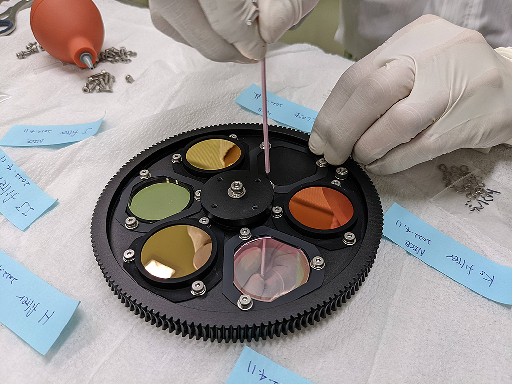 新しく製作したスリットは、アルミニウム鏡に銀と保護膜コーティングを施し、後述する可視カメラスリットビューワの可視領域での反射率も向上させています。初回製作時にはスリット表面に洗浄跡が見られ、光学性能への影響が懸念されたため、再製作を行い、問題がない事を確認しました。また天体のフラックスを較正するための撮像用光学フィルターである、J、H、Ksの3種類の標準フィルターを新しくインストールしました(図3参照)。