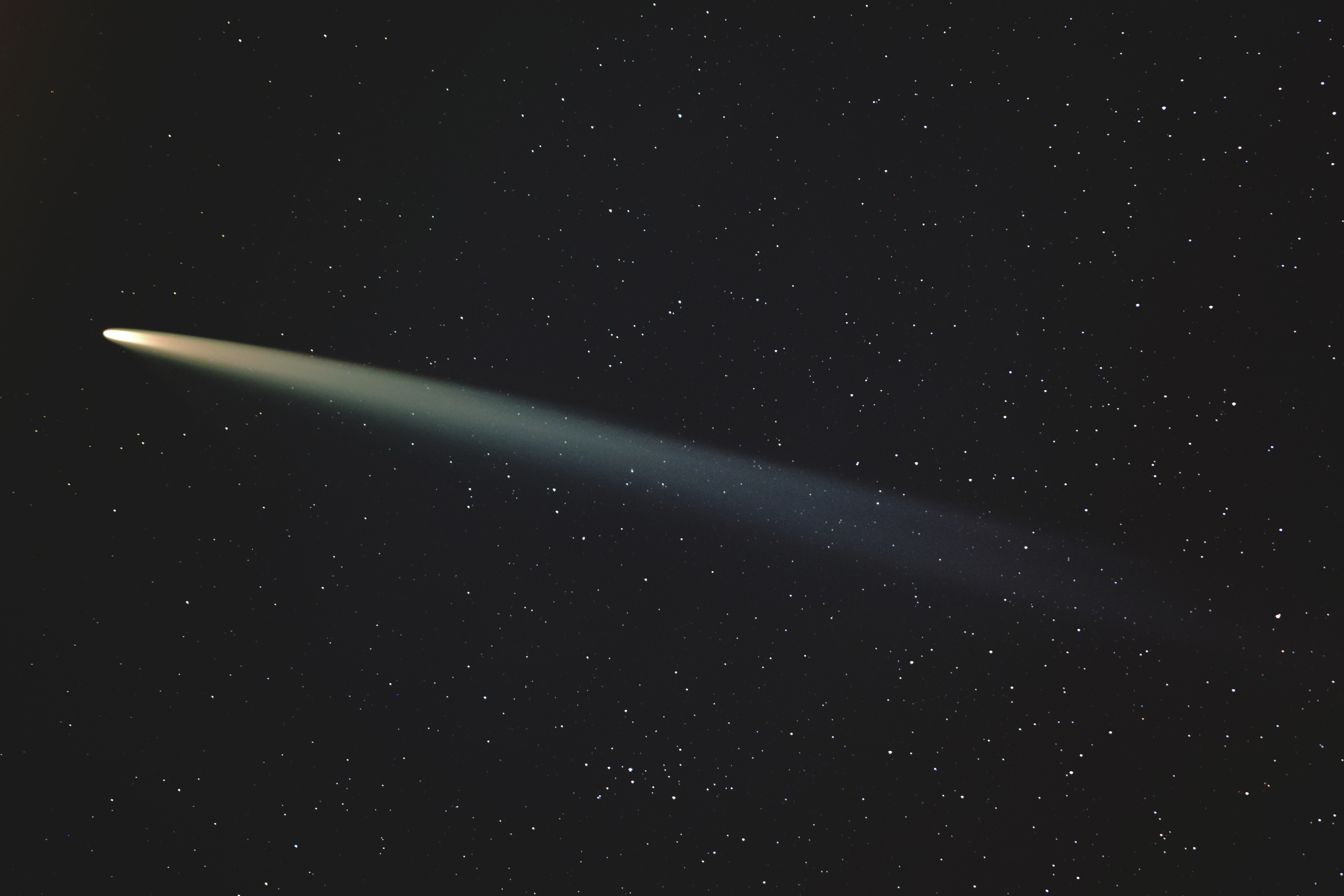 紫金山・アトラス彗星 (C/2023 A3) は2023年1月に中国の紫金山天文台の天文学者によって最初に発見され、同年2月に南アフリカの小惑星地球衝突最終警報システム (ATLAS) 望遠鏡で再検出されました。無数の彗星の源と考えられている 太陽系を球殻状に取り巻くオールトの雲からやって来たと考えられてるこの彗星は、放物線軌道の非周期彗星で、太陽への接近は一度きりです。彗星の本体 (核) は氷や岩石で形成されたもので、太陽に近づいた際に一時的にガスを纏ったコマや、表面から放出された塵やガスが太陽の光に反射して尾 (テイル) として観測されます。 この彗星は非常に大型で、核の直径が約20-40kmにもなります。