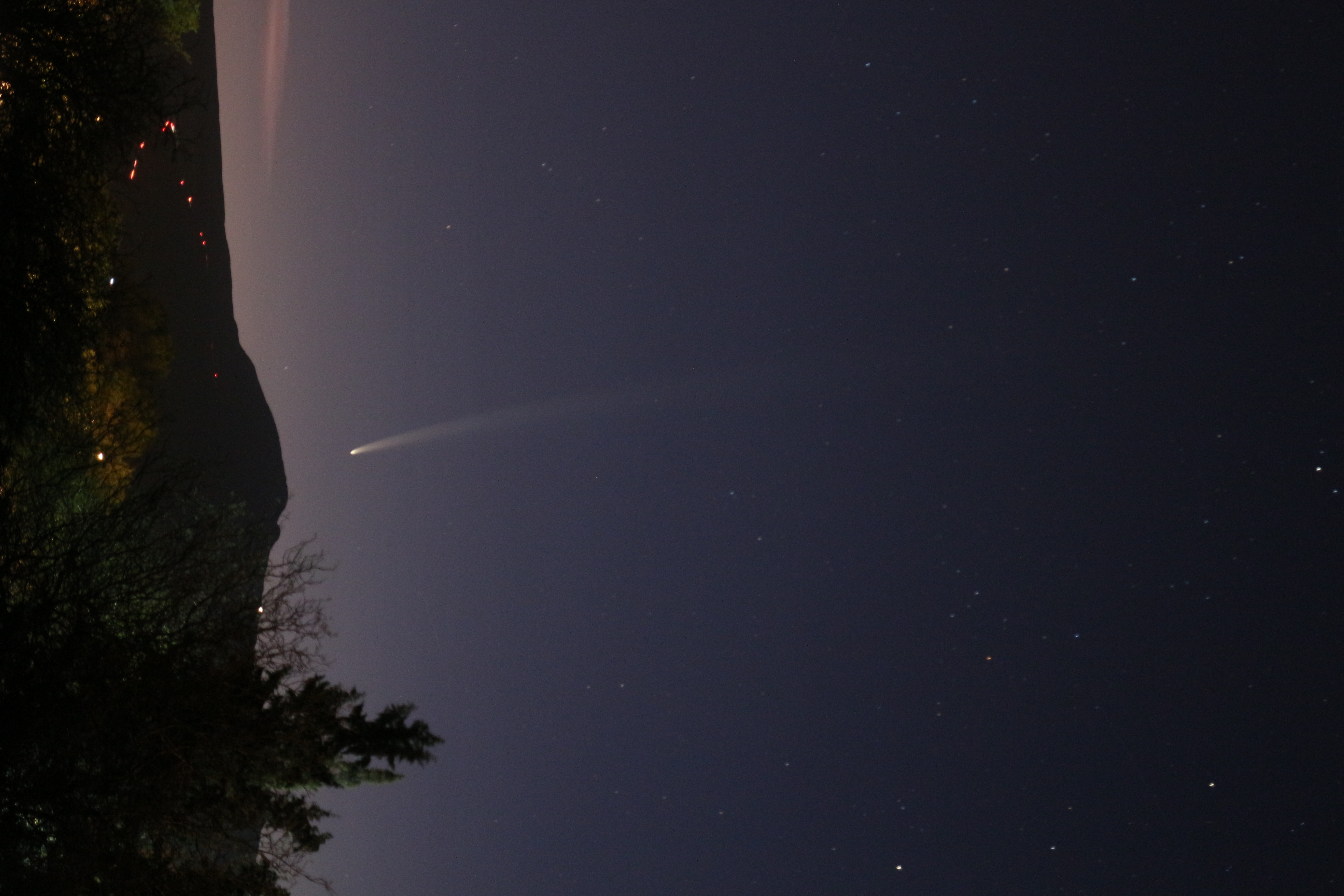 ▲サンペドロ・デ・アタカマTAO山麓施設からの紫金山・アトラス彗星。彗星の右下、山の峰のところにTAO山頂施設の光が見えます。左下には山頂へ向かう作業車の車列の赤いテールランプが見えます。