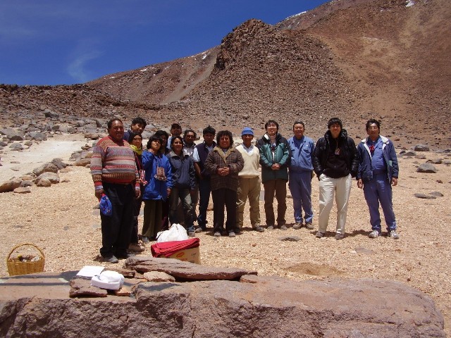 サンペドロ・デ・アタカマ住民の方々とともに、チャナントール山山腹の道路開始場所付近(標高5100m)にて伝統的な作法での地鎮祭を行いました。 今後、ALMA プロジェクトおよび他の運用中の望遠鏡関係者とも綿密な話し合いを経て、チャナントール山頂アクセス道路の工事に着手します。