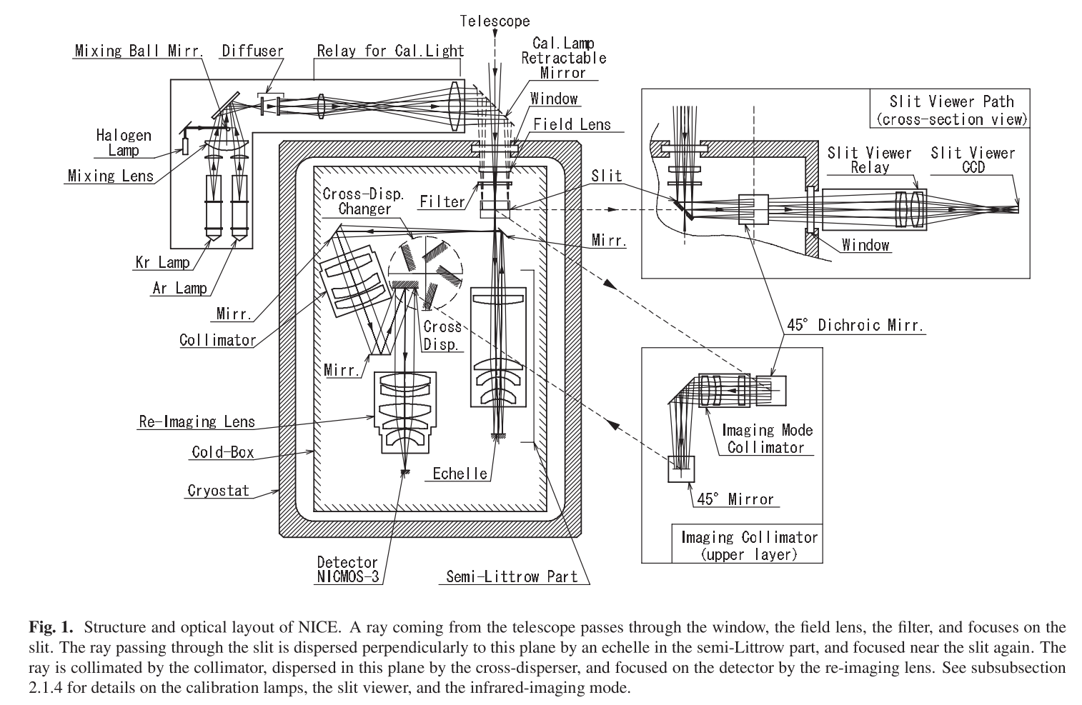 - The whole system, except for the calibration lamps and the slit viewer, is mounted on an optical bench in a cryostat shaped as a box.