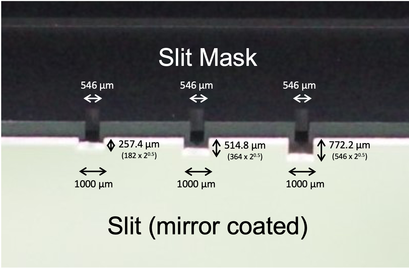 - The slits are available in three different widths, 257 µm, 515 µm, and 772 µm, respectively, when viewed from the front of the slit. The common length in the spatial direction is 546 µm.