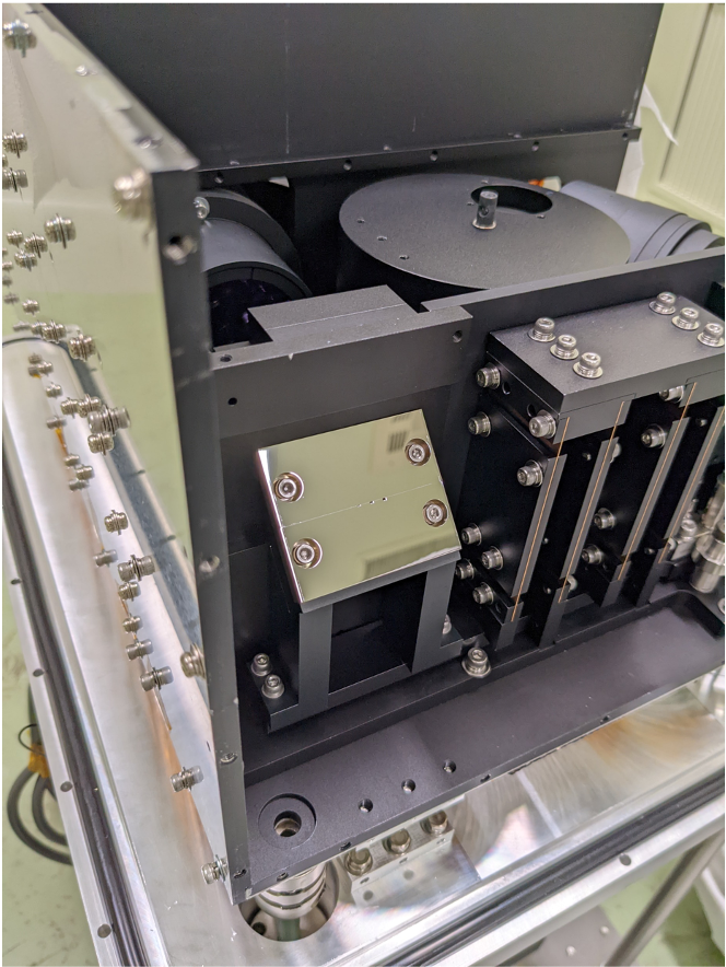 - The optical bench consists of a thin aluminum plate and reinforcing plates, which are assembled so as to also make a box structure, named "cold-box".