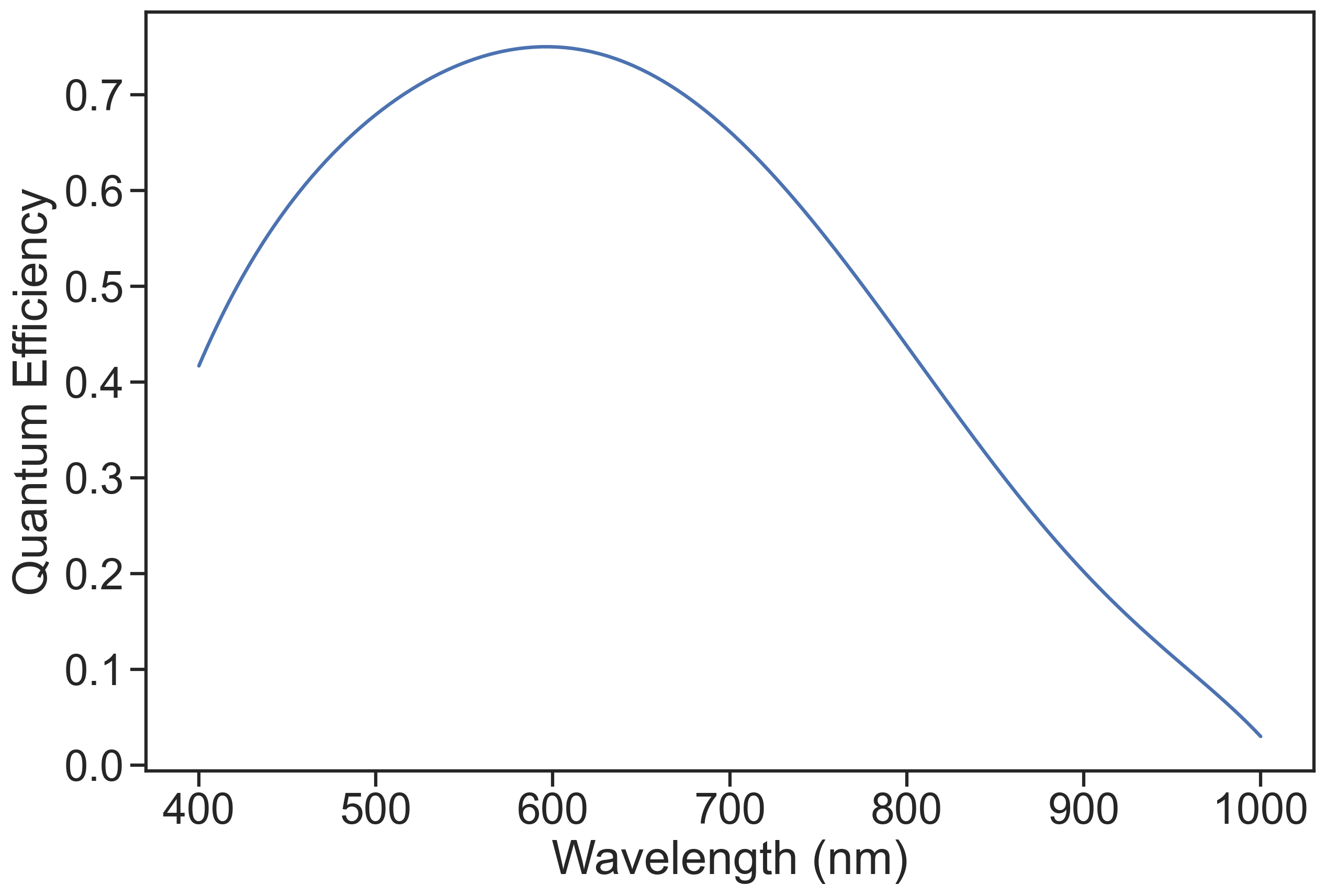 - The quantum efficiency has not been measured, but Bitran Corp. officially publishes the relative quantum efficiency. The figure below shows it scaled to a peak value of 75%, which is the measurement published by several manufacturers.