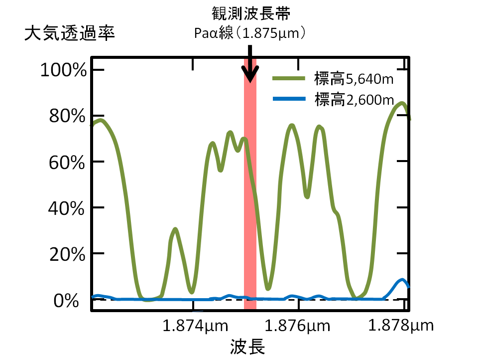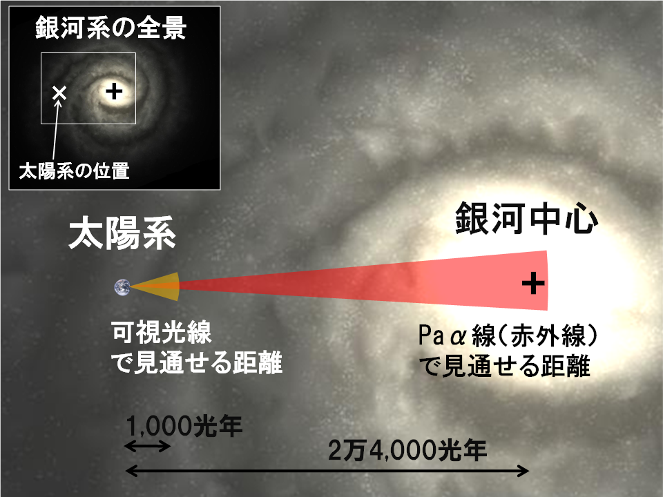 [1] 銀河の中心まで見通す水素赤外線輝線 私達の住む銀河系(天の川銀河)は約2000億個の星と、その材料であるガスと塵から 構成されています。特に銀河系の中心部では星が活発に形成されており、それに伴い 生まれるエネルギーは銀河系全域の活動に影響を与えています。 銀河系のエンジンとも言える中心部の構造については、これまでに多くの観測と研究が なされてきました。しかし、中心部には塵が濃く分布しており内部を隠しているため、 その構造は十分に解明されていません。銀河系中心部のような活発な領域ではガスの多くは電離しています。その主成分である 水素電離ガスは紫外線から赤外線にかけての波長帯に多種の輝線を放射します。中でも 赤外線帯の輝線は塵による吸収をうけにくい特徴があります(赤外線は強い透過力を 持ちます)。そのため、電離水素ガスが放射する赤外線輝線を観測することで、 塵に隠された銀河系中心部のガスの分布構造を調べることができます。 電離水素ガスが放射する最も強い赤外線輝線は、1.875umのPaα(パッシェン・アルファ ) 輝線です。しかし、Paα輝線は地球大気に強く吸収される 波長帯に位置するため、地上望遠鏡による観測は殆ど不可能とされています。 銀河系中心部におけるPaα輝線の観測は、ハッブル宇宙望遠鏡によるものが数例あるもの の、 その構造を明らかにするほど広範囲にわたる観測は行われていません。
