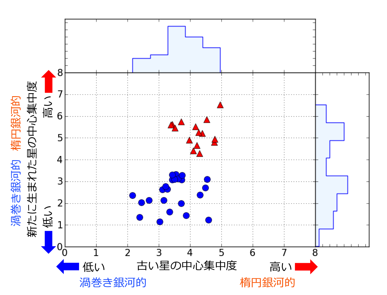 銀河は様々な姿・形をしていますが、そのほとんどはハッブル系列と呼ばれる形態分類法で大きく楕円銀河と渦巻銀河の2つに綺麗に分類する事ができます(⇒注2)。しかし、この形態がいつ、どのようにしてできたのかはよく分かっていません。 今回の発見は、銀河の形成段階で星形成を行なっている領域自体がこの2つに明確に分離することを示しており、銀河の形がその形成段階からわかれていた可能性を示唆しています。これは、銀河の形態がどのような過程を経てできるのかを解き明かす手がかりとなります。現在の銀河進化の枠組みの中では、楕円銀河は遥か昔の衝突合体によって一気に星を作ったあとで楕円銀河の形状に落ち着き、その後は星形成を殆ど行わないと考えられていました。しかし、今回の観測では楕円銀河の中心でいまだ爆発的な星形成を行い、その星質量を増やしつつあるものがあることを示しています。これは楕円銀河の質量形成に、これまで考えられていなかった経路があることを示唆します。 今後もさらに多くの爆発的星形成銀河の観測を行い、その性質と成長過程を詳細に明らかにしてゆく予定です。