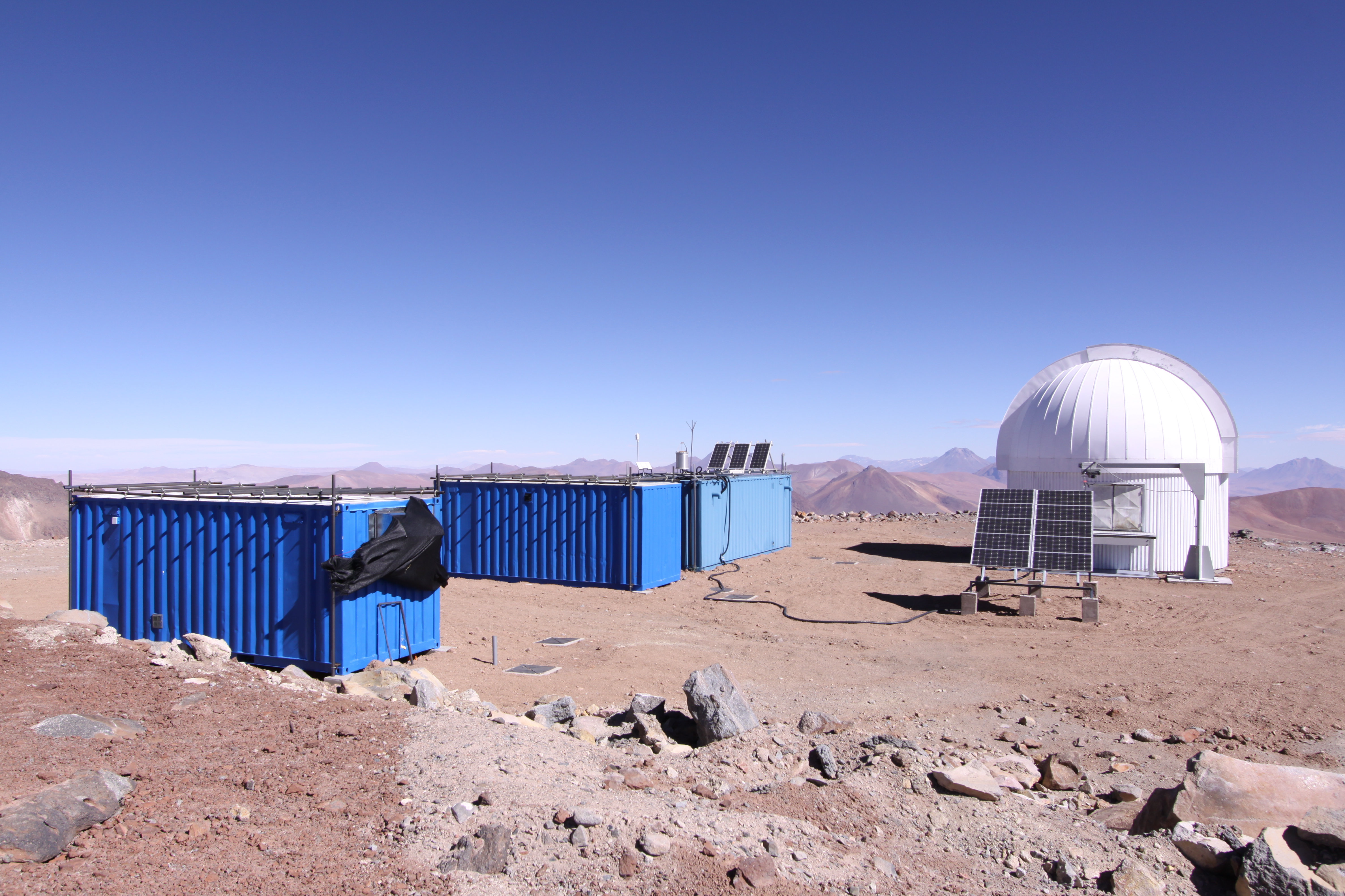 図2: 今回観測を行った標高5640mの東京大学アタカマ天文台(左)と、中間赤外線カメラMAX38を搭載したminiTAO望遠鏡(右)